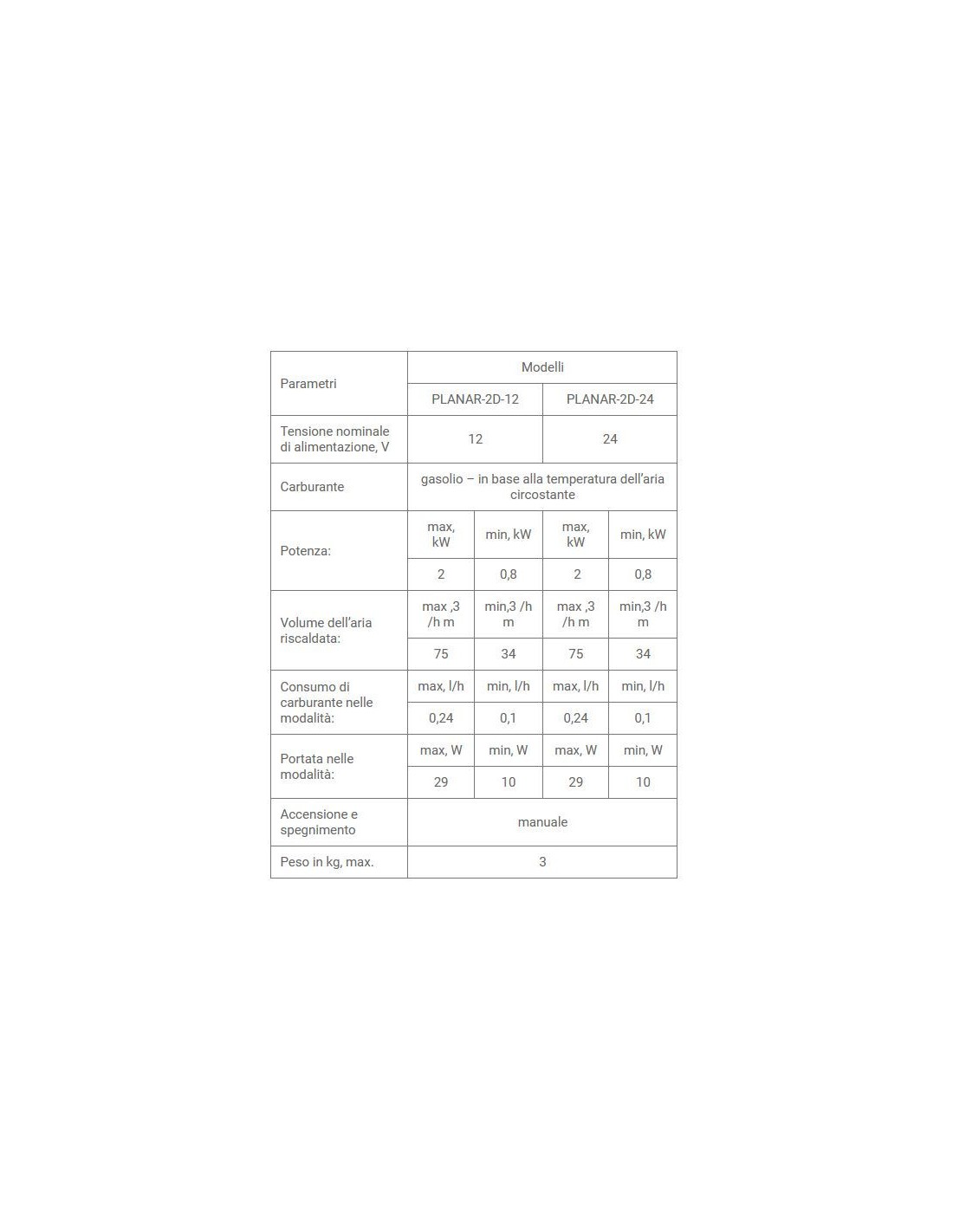 Il Planar 2D a 12 VDC è il più piccolo generatore di aria calda della serie Planar, ciò permette l’installazione in automezzi di dimensioni ridotte quali VAN e simili.