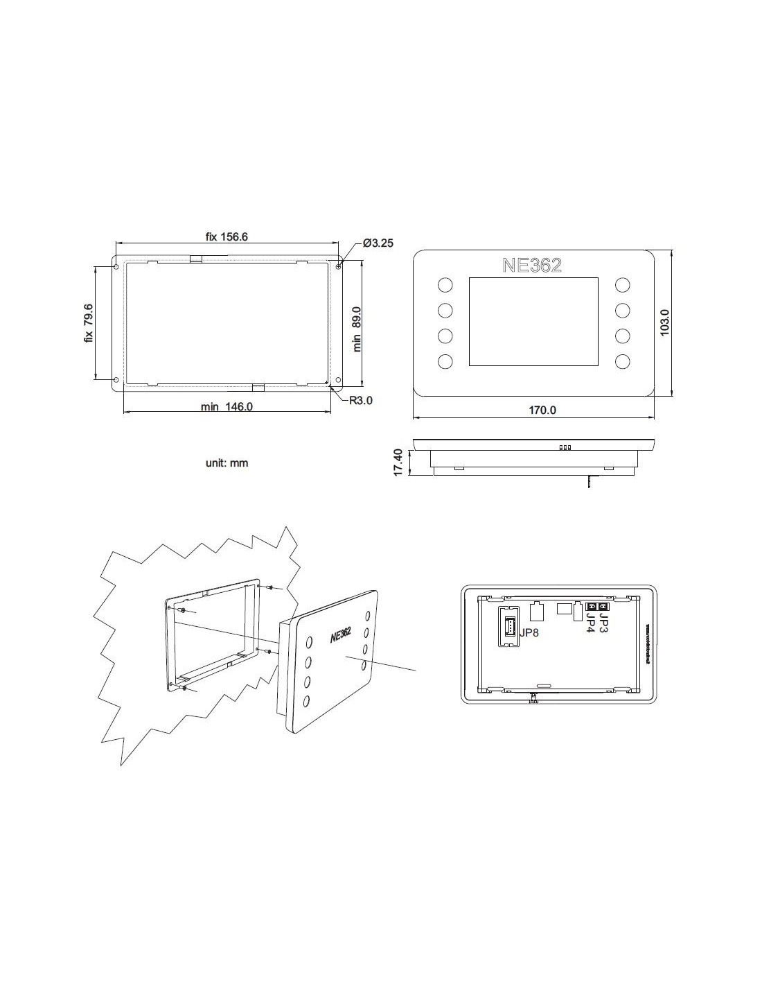 Auf der Rückseite des Panels befinden sich der Anschluss für das serielle Kabel (JP8), der Anschluss für den optionalen externen Temperatursensor (JP3) und der Anschluss für den externen internen Temperatursensor (JP4).