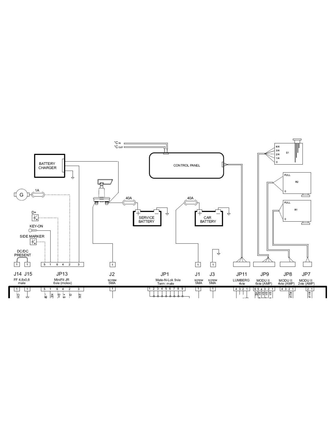 - F2: 20-A-Sicherung, angeschlossen an die Betriebsbatterie, um den Kühlschrank mit Strom zu versorgen.