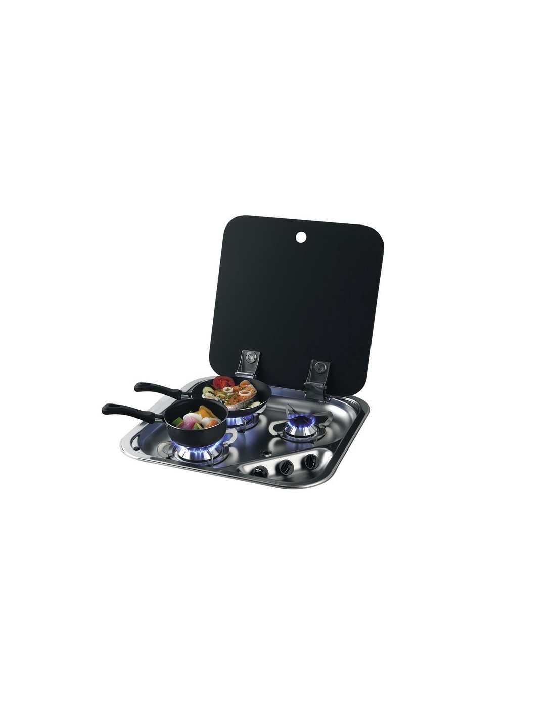 Rechteckiger Einbau-Gaskocher aus Edelstahl mit 3 Brennern, Brenner mit selbstschließendem Deckel, Stützgitter aus Edelstahl, befestigt mit Antivibrations-Gummipolstern.