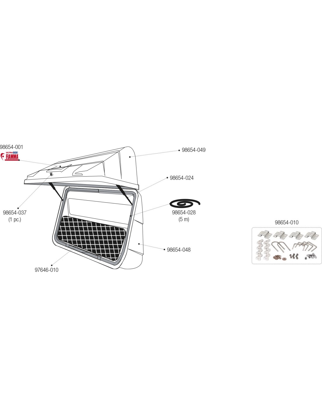 Komplett mit Edelstahlscharnieren und Aluminiumprofilen und ausgestattet mit einem Netz zum Halten der transportierten Gegenstände.