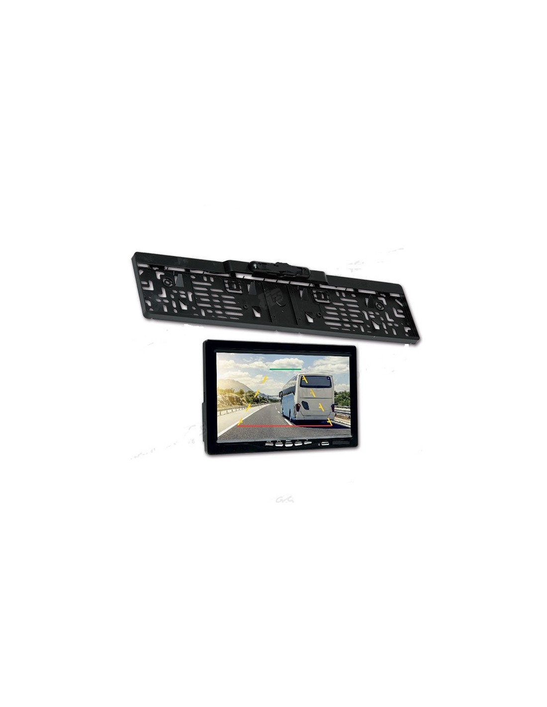 Das Kit besteht aus: Nummernschildhalter mit verstellbarer Farbrückfahrkamera, integriert in die Konstruktion, 7" TFT/LCD-Monitor, internem Lautsprecher einschließlich Halterungen zur Montage des Monitors und IR-Fernbedienung.