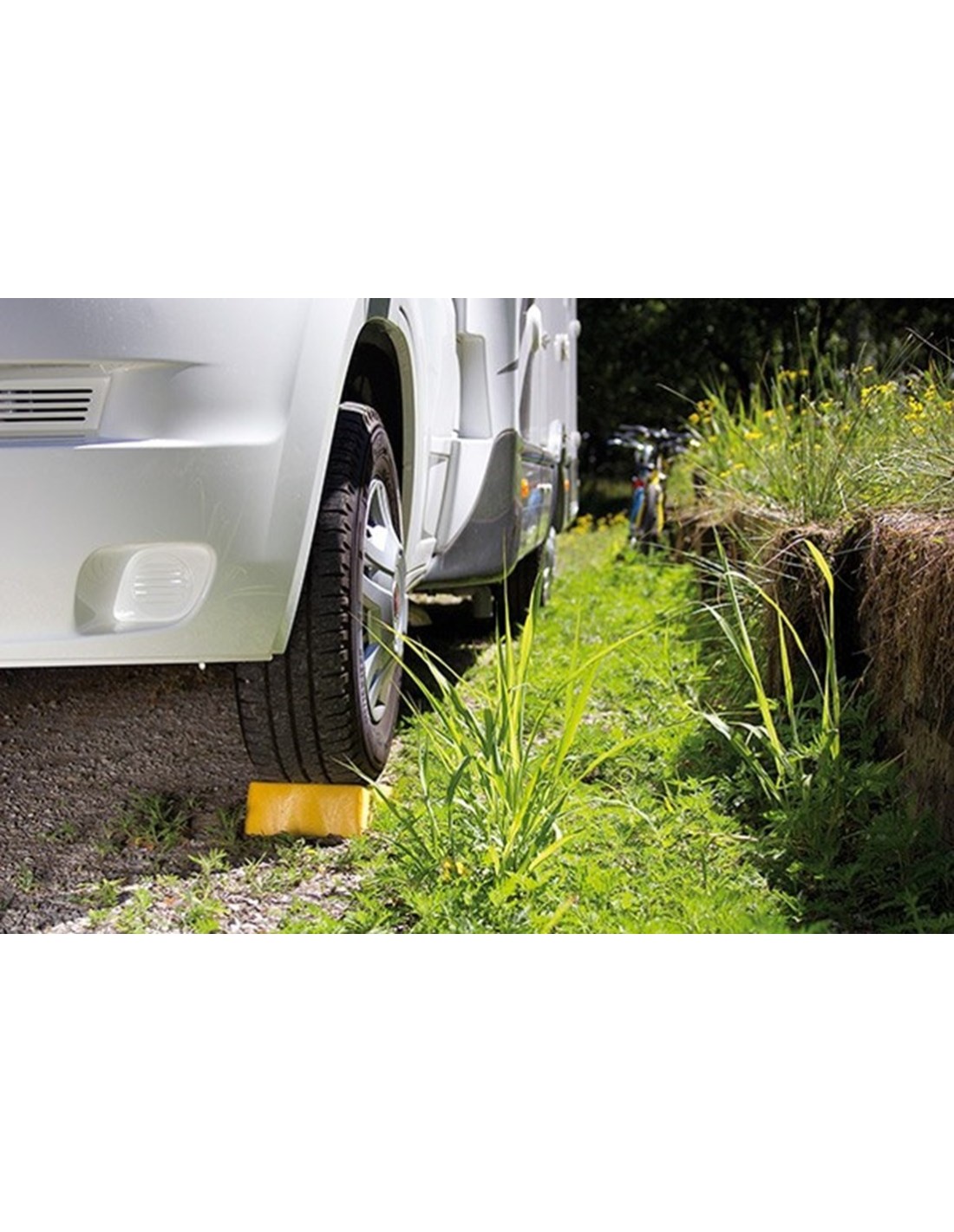 Chock Level kann mit Fiamma-Keilen kombiniert werden, um das Rad zu blockieren.
