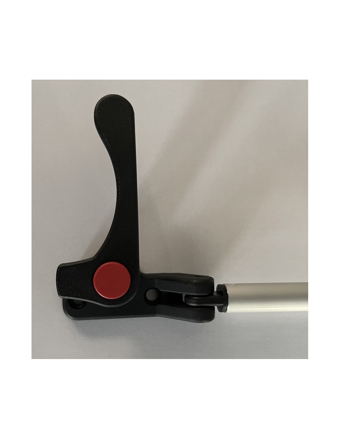 Schwarzer linker Griff. Roter Knopf, Plastoform 6000-Serie Der Griff gilt als links, wenn er von innen gesehen links vom Fenster montiert wird. In der geschlossenen Position ist der Hebel horizontal, während er in der geöffneten Position vertikal ist.