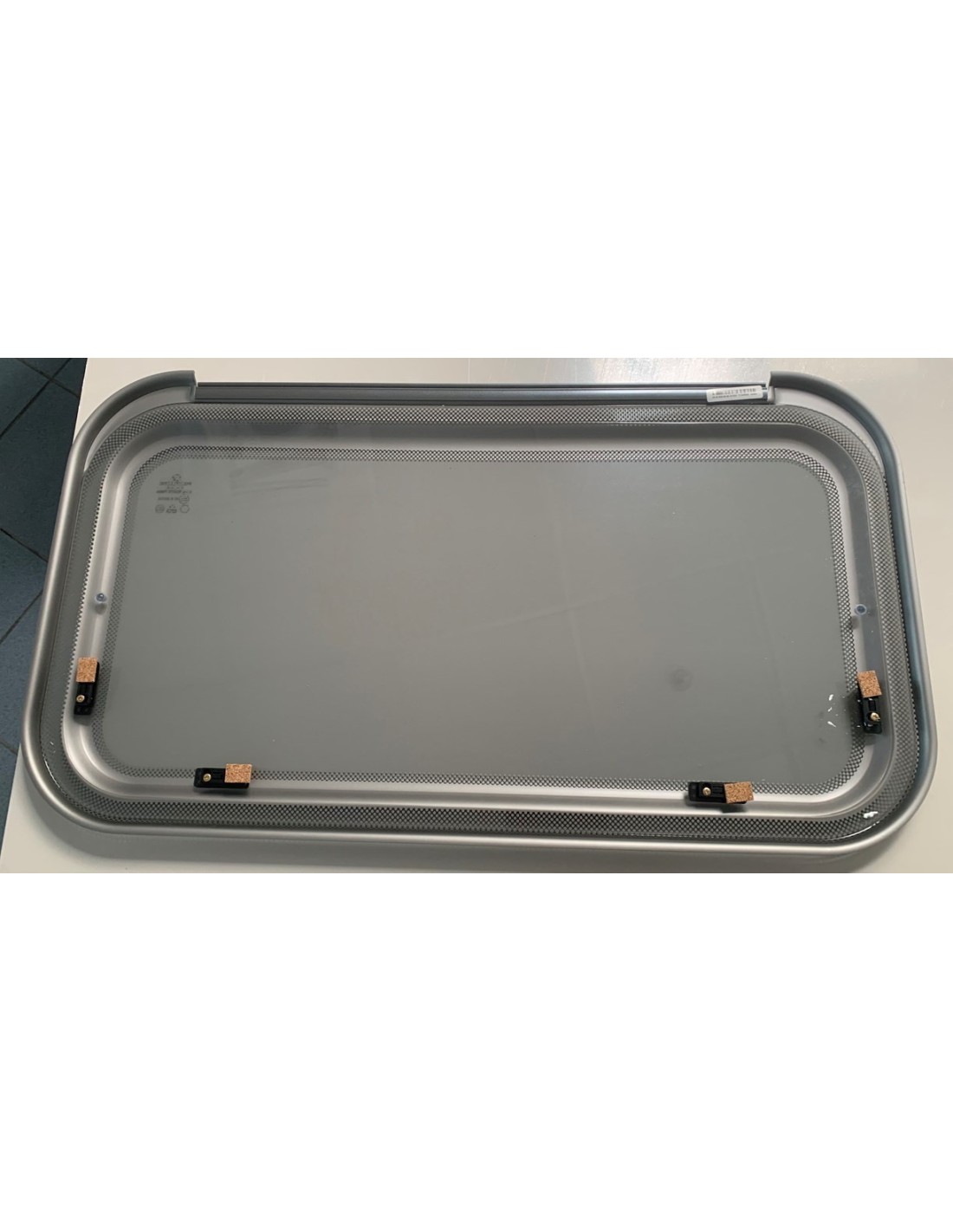 Sockelfenster mit doppeltem grauem Acrylglas, mit grauem Siebdruck und anthrazitfarbenem Profil.