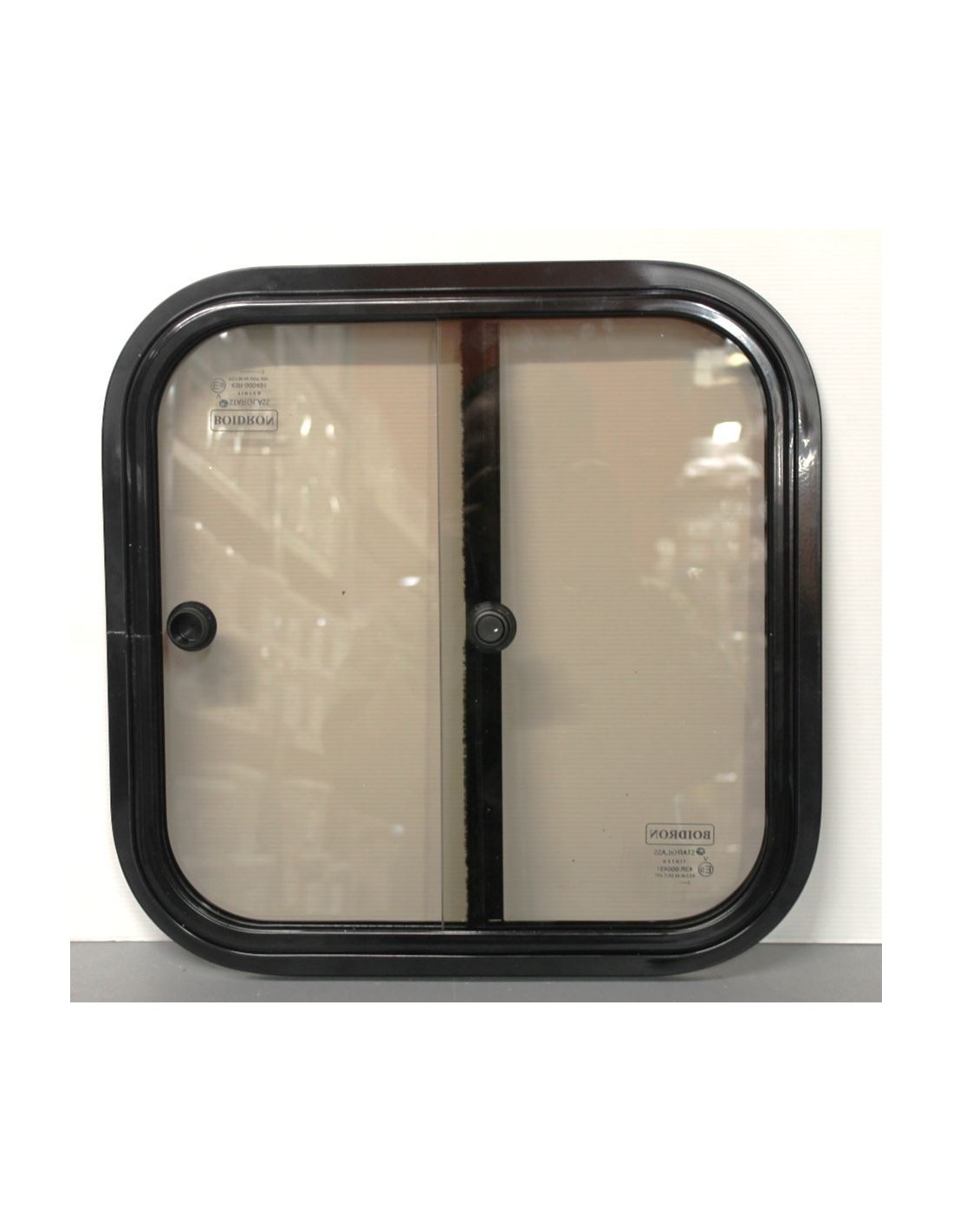 Umkehrbares Schiebefenster in verschiedenen Größen aus schwarzem Aluminium und braunem Rauchglas. Länge über 899 mm.