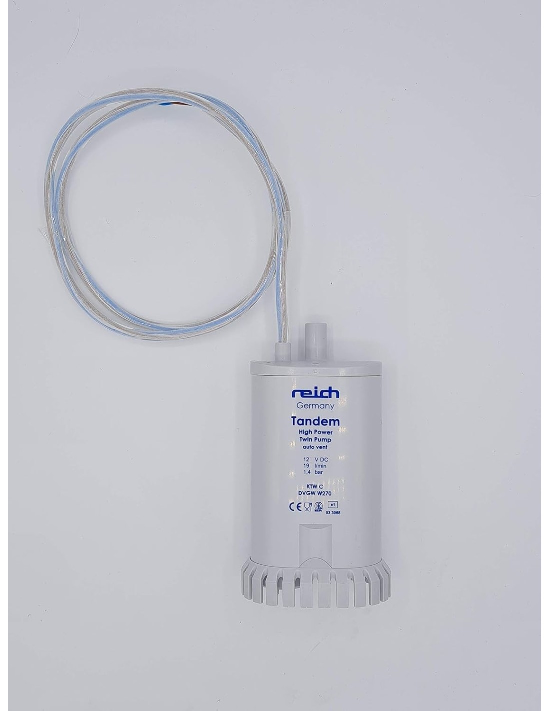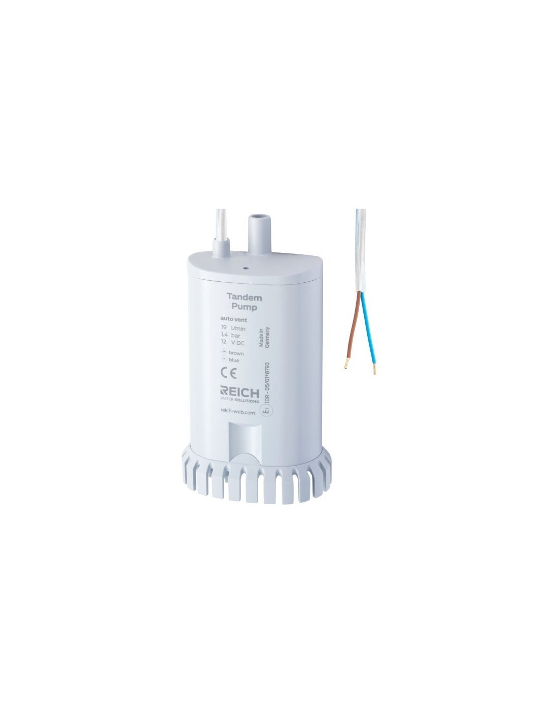 REICH POWER JET PLUS Tauchpumpe 25 lt - 1,1 bar - 12VDC Spannung 12 Volt (+ braunes Kabel) Maximaler Druck 2,1 bar Energie 25 Liter/min Erforderliche Tanköffnung 55mm Kabellänge 1000mm Stromaufnahme 75 W Länge: 17,5 cm Breite: 16cm Höhe: 5,4 cm Gewicht: 280 g Zylindrischer Schlauchverbinder für Rohre mit 12 mm Innendurchmesser