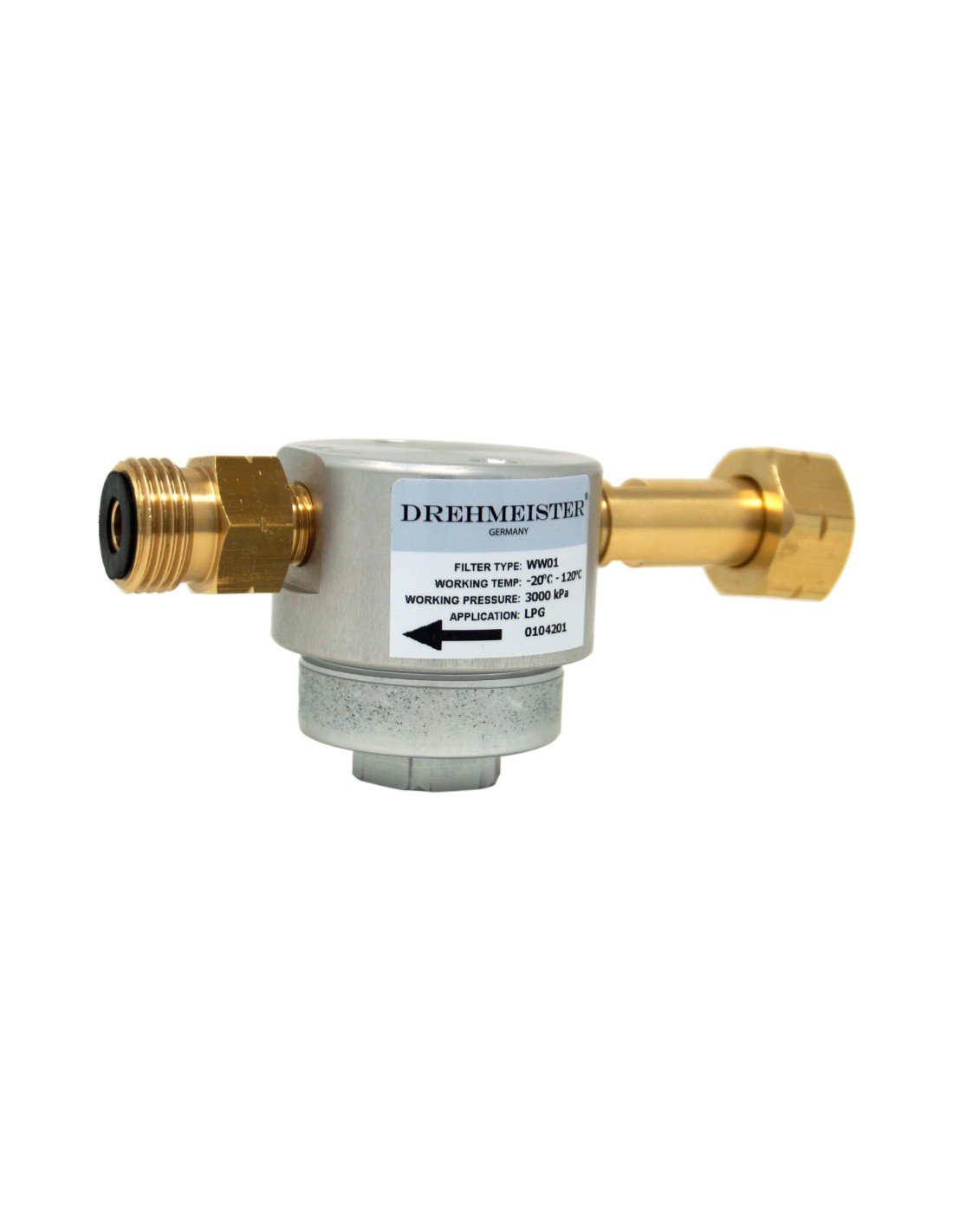 DREHMEISTER-Gasfilter zur direkten Montage am Auslassventil der Gasflasche oder des Tanks oder zum Einbau in die Gaskassette. Der austauschbare Filtereinsatz besteht aus Fiberglas.