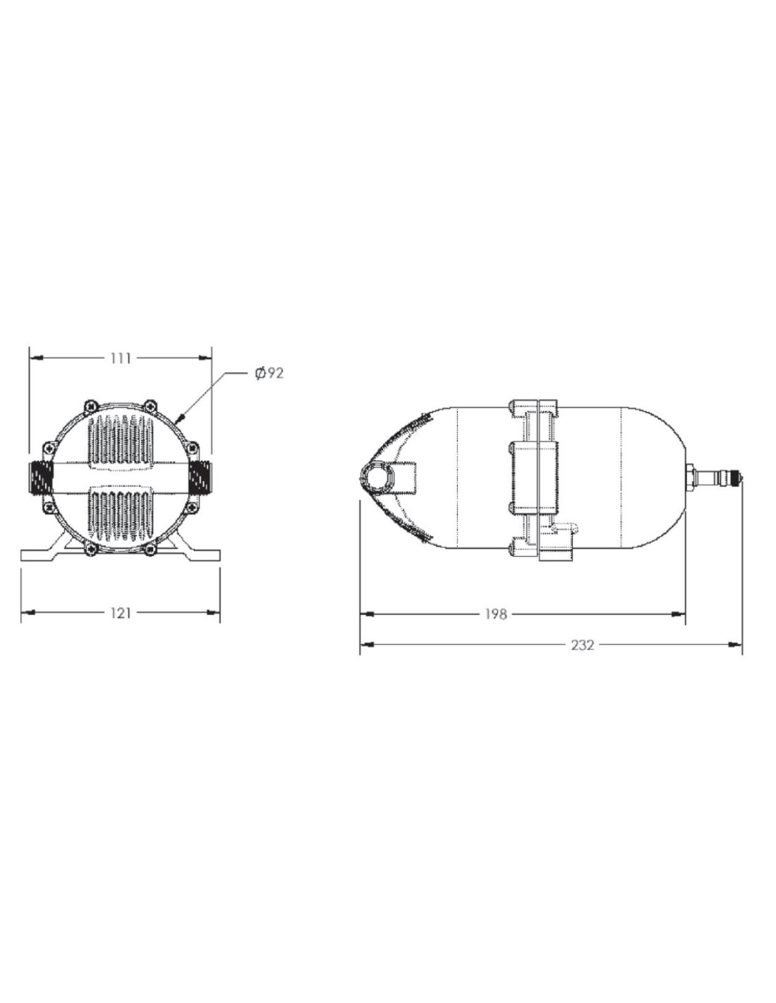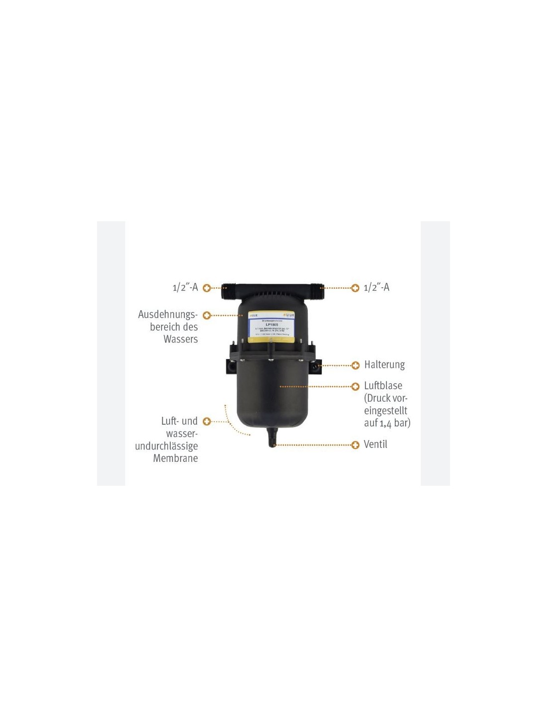Un recipiente de aire a presión constante con una membrana flexible. La presión pulmonar está preajustada a 1,4 bar y puede modificarse con una bomba de bicicleta. Funcionamiento óptimo si este valor está cerca de la presión de reinicio de la bomba.