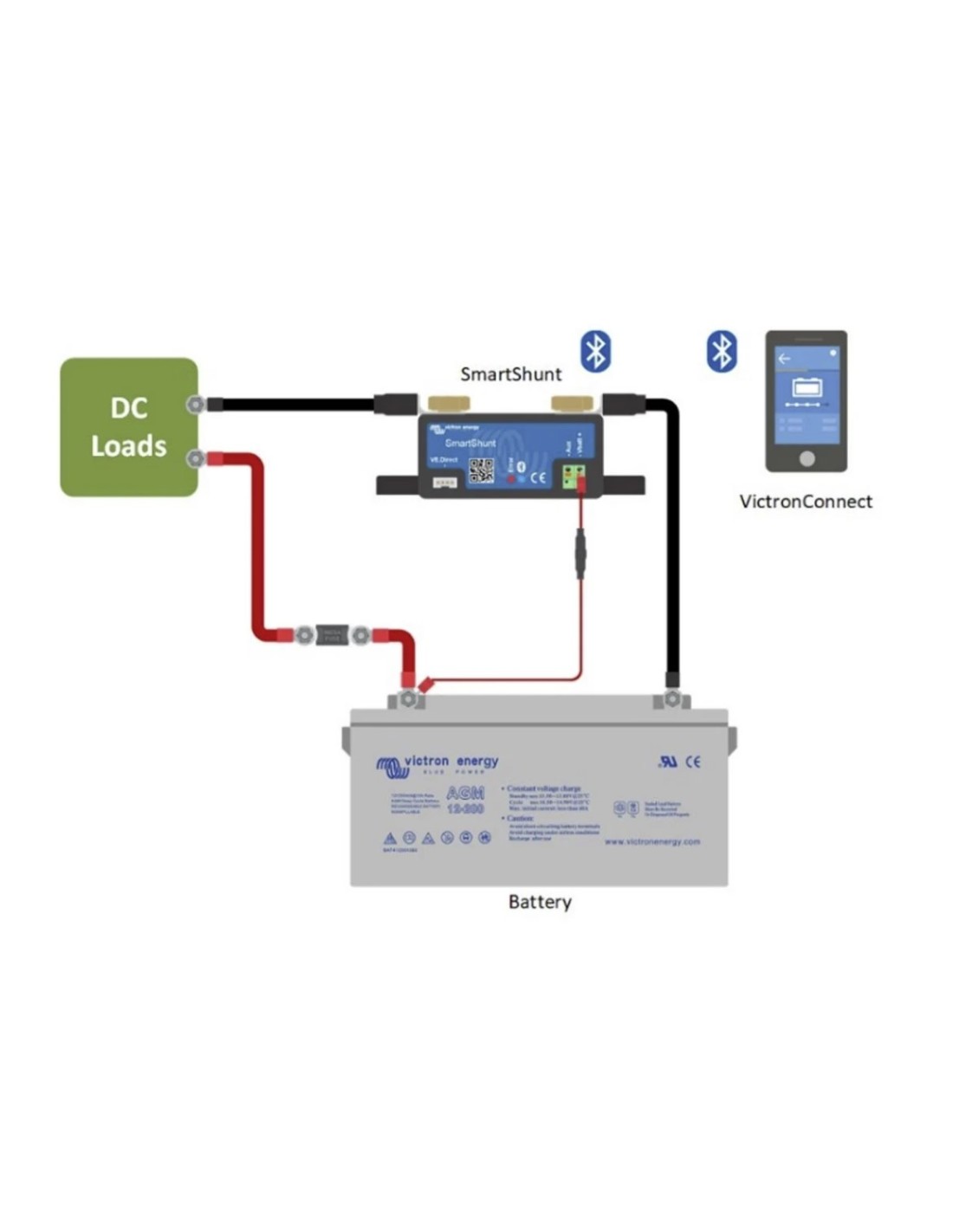 SmartShunt es un monitor de batería todo en uno que utiliza su teléfono como pantalla. SmartShunt se conecta mediante Bluetooth a la aplicación VictronConnect en su teléfono (o tableta) y podrá leer fácilmente todos los parámetros de la batería monitoreados, como el nivel de carga, el tiempo de funcionamiento restante, información histórica y mucho más.