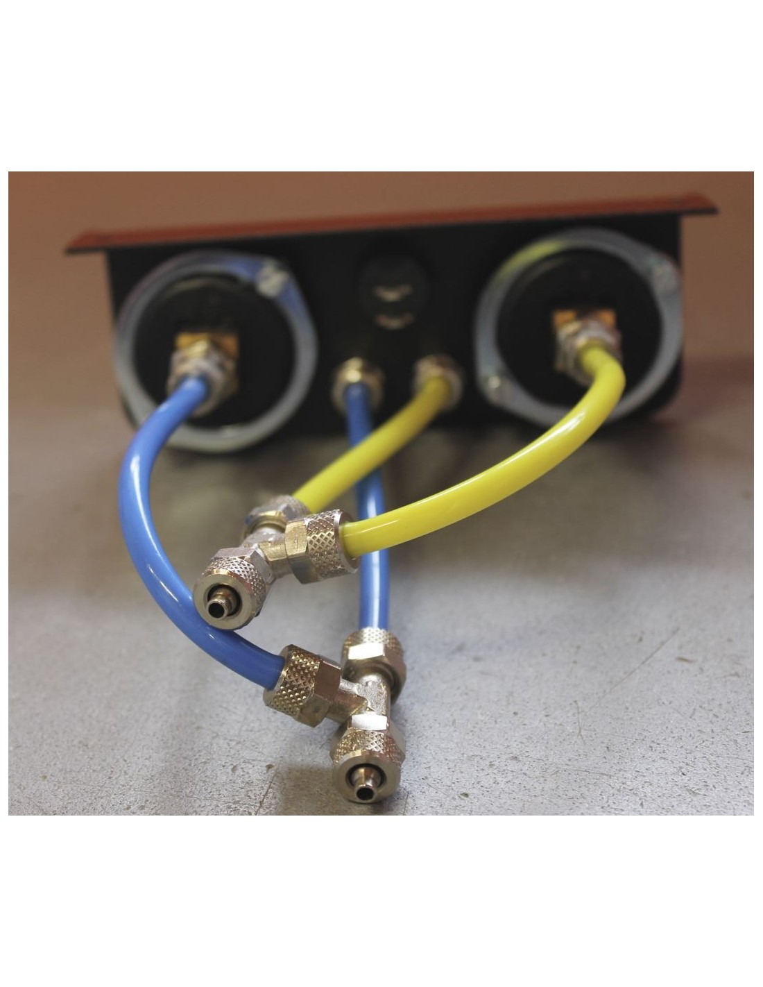 Minicompresor metálico DRIVE-RITE de 120 psi con accesorios, válvulas de retención y tuberías para conexión al panel de manómetros.