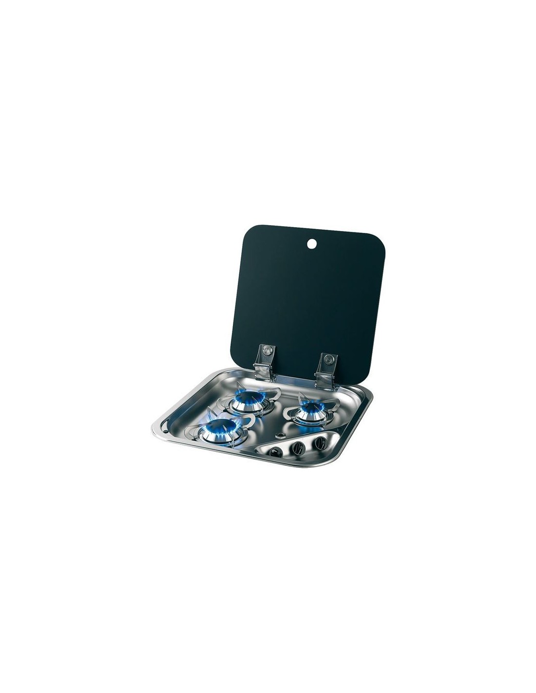 Encimera de gas de empotrar rectangular de acero inoxidable de 3 fuegos con quemadores equipados con tapa autoblocante, rejilla de soporte de acero inoxidable fijada con tacos de goma antivibración.
