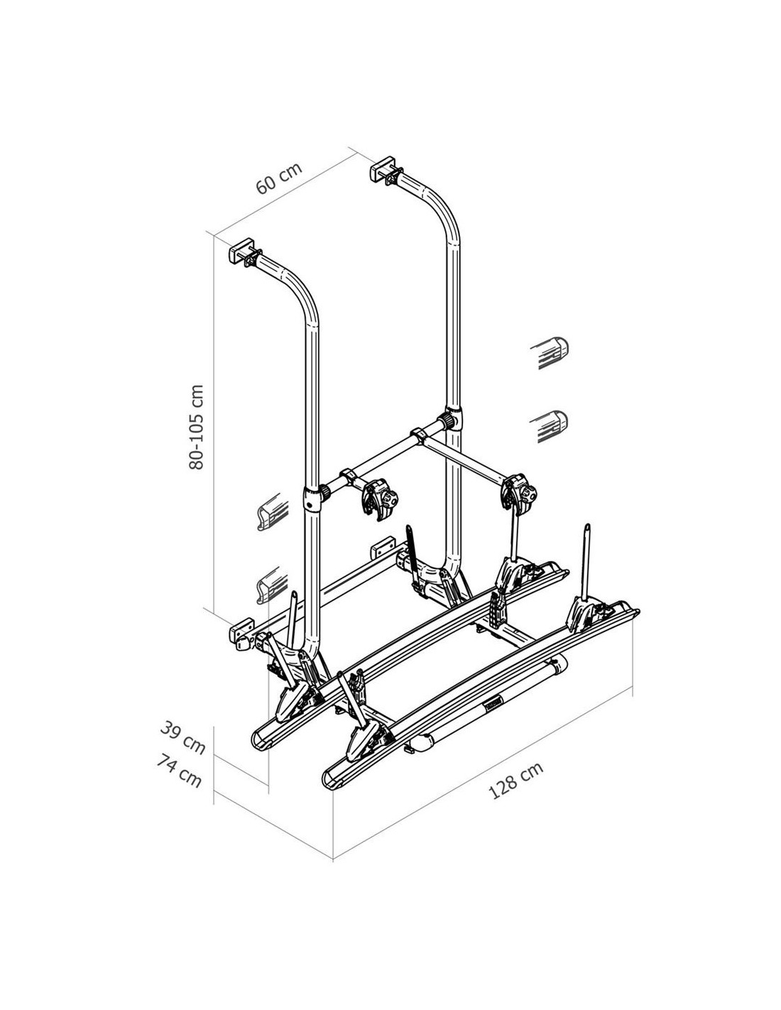 • Capacidad: 2 bicicletas• Carga máxima: 70,0 kg• Peso máximo de la bicicleta: 35,0 kg• Peso: 20,0 kg