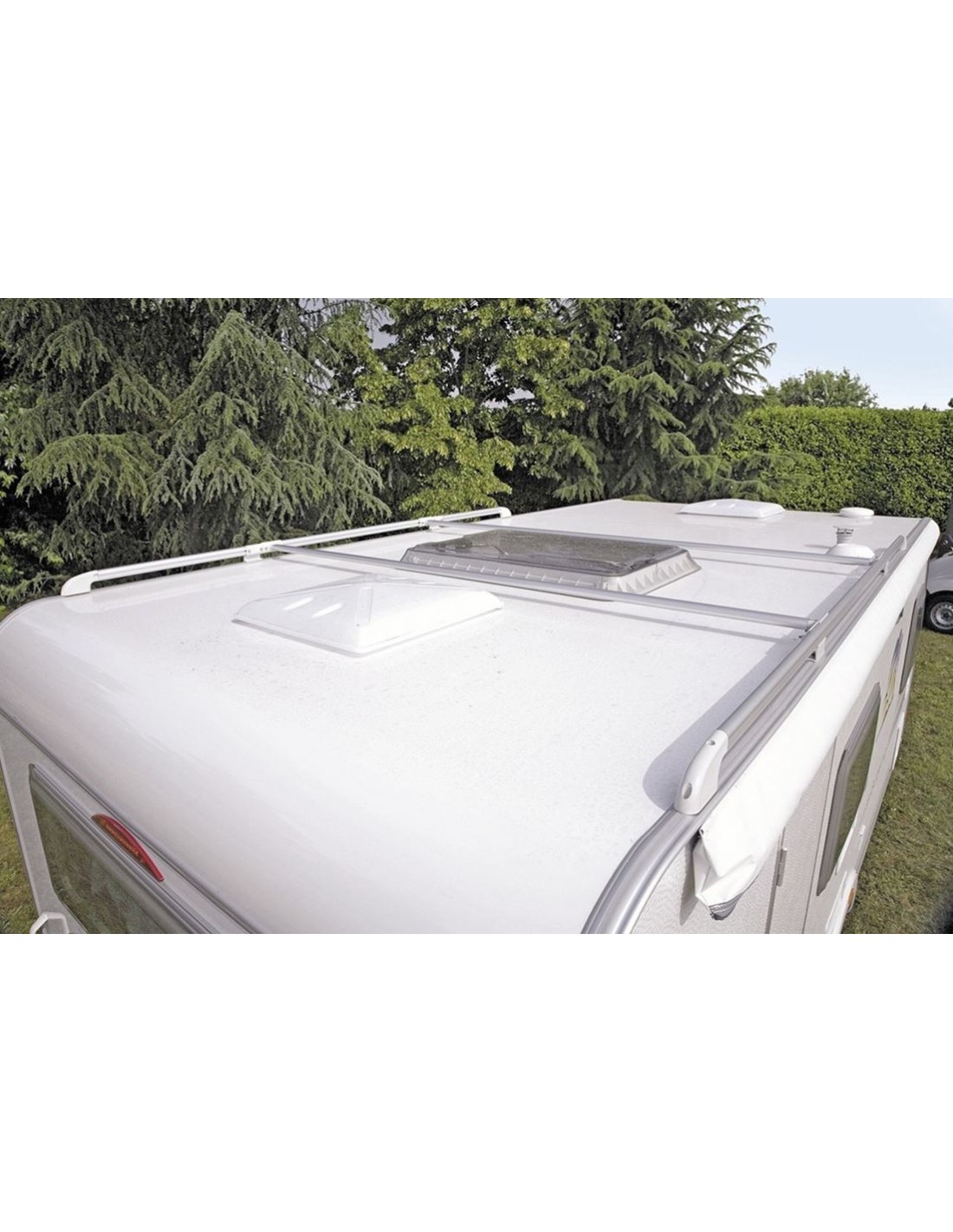 Sistema portaequipajes compuesto por 2 barras longitudinales acortables, fácil de instalar en los techos de campers y caravanas. Los tubos de aluminio anodizado son adecuados para un acoplamiento rápido del riel de barra de fijación opcional.