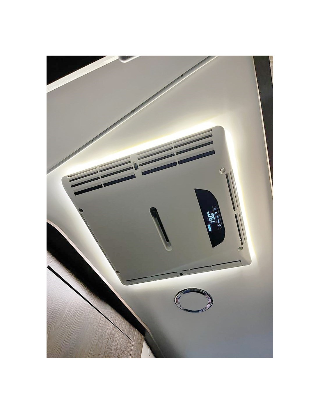 ¿Preocupado por la altura exterior de su caravana? No te preocupes más. Con una altura máxima de sólo 20 cm, OpenAir es el aire acondicionado más bajo del mercado, con un diseño aerodinámico que combina estilo y eficiencia a la perfección. Además, su discreto panel interno de tan solo 4,5 cm incluye aletas verticales de regulación de flujo y selector de orientación del aire, mientras que su luz ambiental orientable crea un ambiente acogedor y sofisticado, manteniendo una altura interna mínima para una mejor adaptabilidad e instalación.