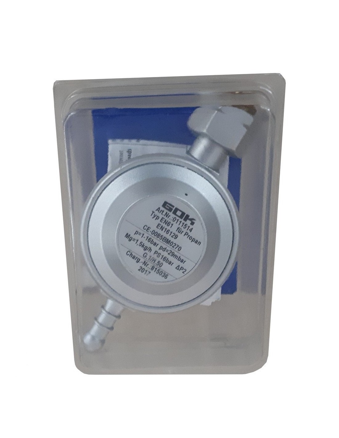 Regulador de gas GOK 29mbar 1,5 kg camping ITA - 01 115 09Tipo de conexión de entrada G.1 = W20x1.814-LH ItaliaTipo de conexión de salida H.4 = G1 / 4 LHTipo EN61 para propanoEN16129