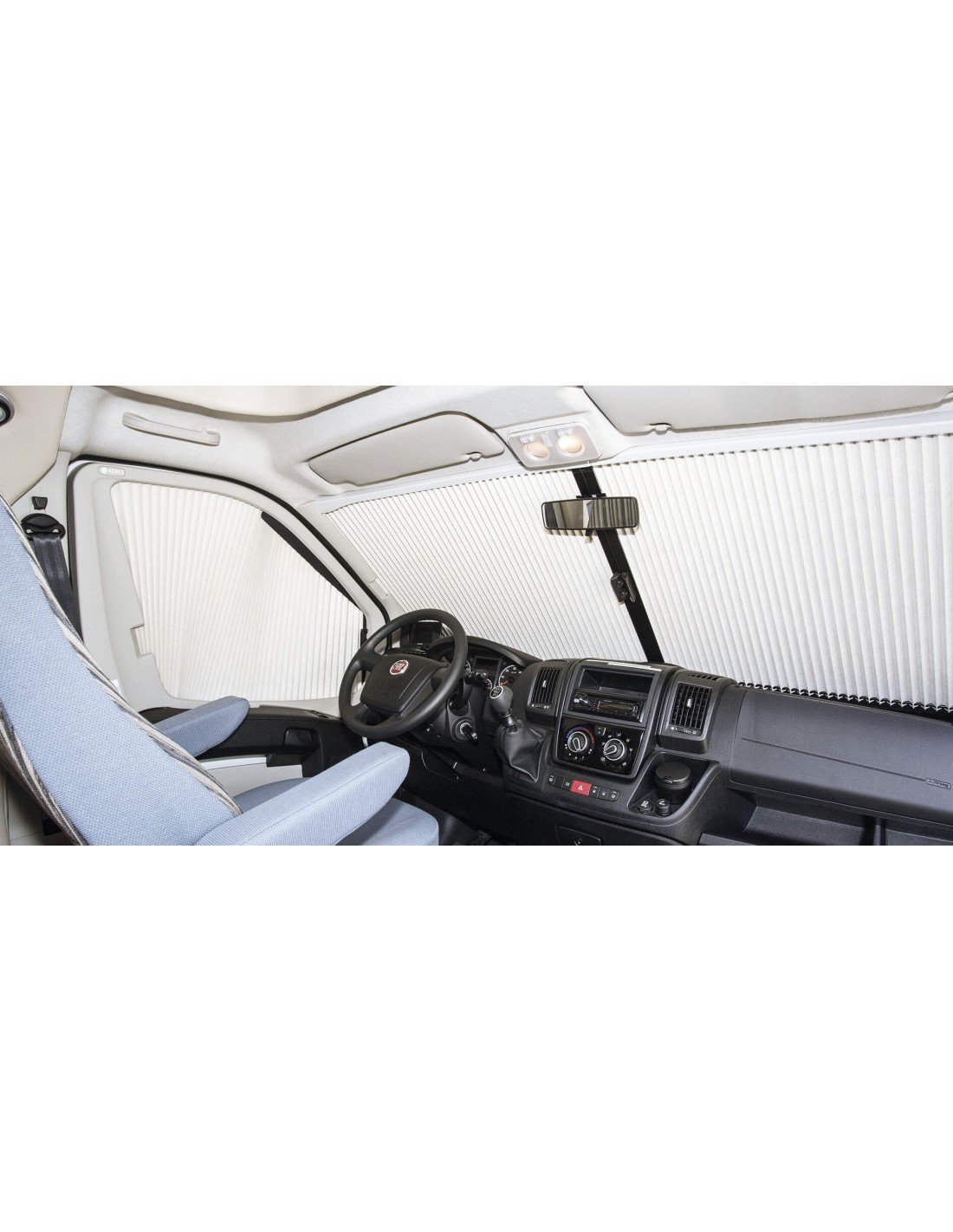 La solución personalizada de apagón para la cabina del conductor protege contra miradas curiosas gracias a un apagón perfecto, aumentando significativamente la zona habitable dentro de la autocaravana.