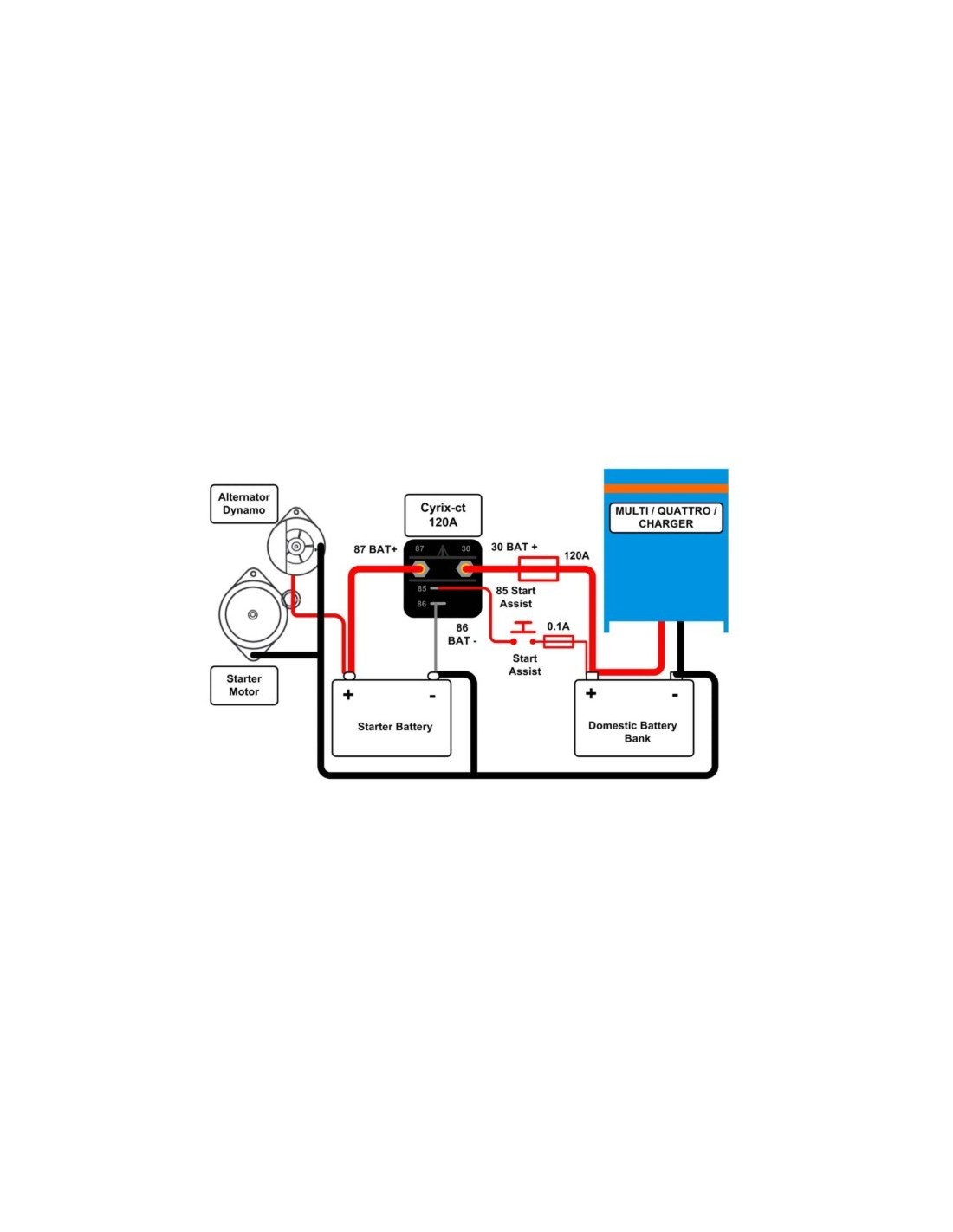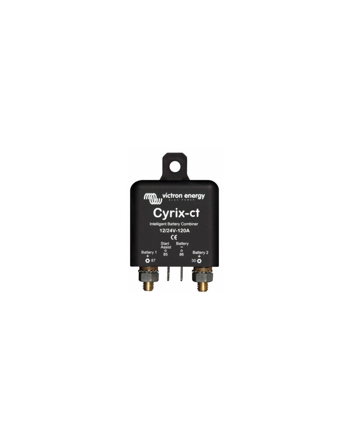 Le Victron Energy Cyrix-ct est constitué d'un relais contrôlé par microprocesseur qui déconnecte automatiquement les batteries lorsque la tension descend en dessous d'une certaine valeur et les reconnecte lorsque la tension de l'une ou l'autre batterie dépasse une valeur prédéfinie.
