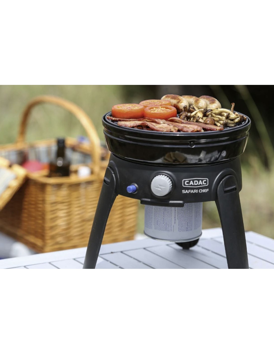 Serrez simplement la cartouche de gaz directement sous le Safari Chef HP ou utilisez-la avec un régulateur de pression de gaz, tel que le Dual Power Pak.