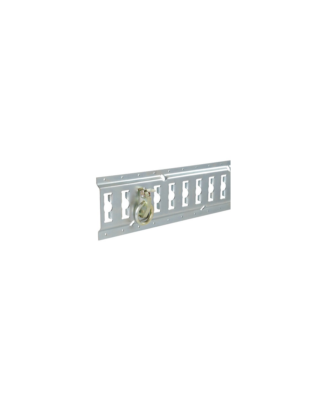 Deux barres polyvalentes en aluminium anodisé à appliquer sur les murs du garage, chacune équipée de 5 crochets à œil coulissants, d'embouts rouges et de vis de fixation.