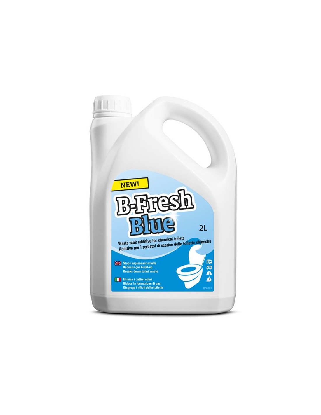B-FreshBlue identifie une nouvelle gamme de liquides chimiques à bas prix dédiée au traitement des sanitaires à bord des camping-cars et caravanes et également adaptée aux toilettes portables. B-Fresh Blue est un produit au parfum de citron dédié au réservoir d'eaux usées nautiques ou à cassette, avec une capacité de désintégration élevée et capable d'éliminer les mauvaises odeurs et de réduire la formation de gaz.