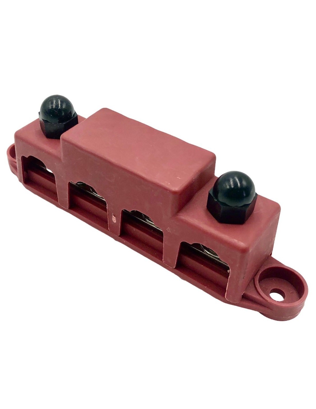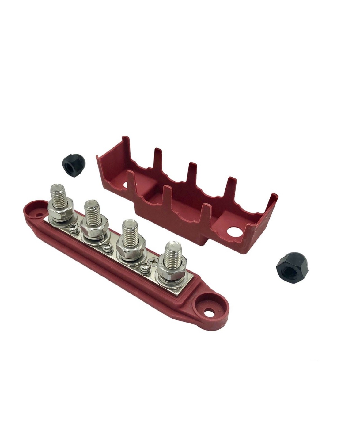Barrette de connexion rouge 4 broches x M10 + 4 vis x M4 maximum 250A - 48vdc avec capot de protection
