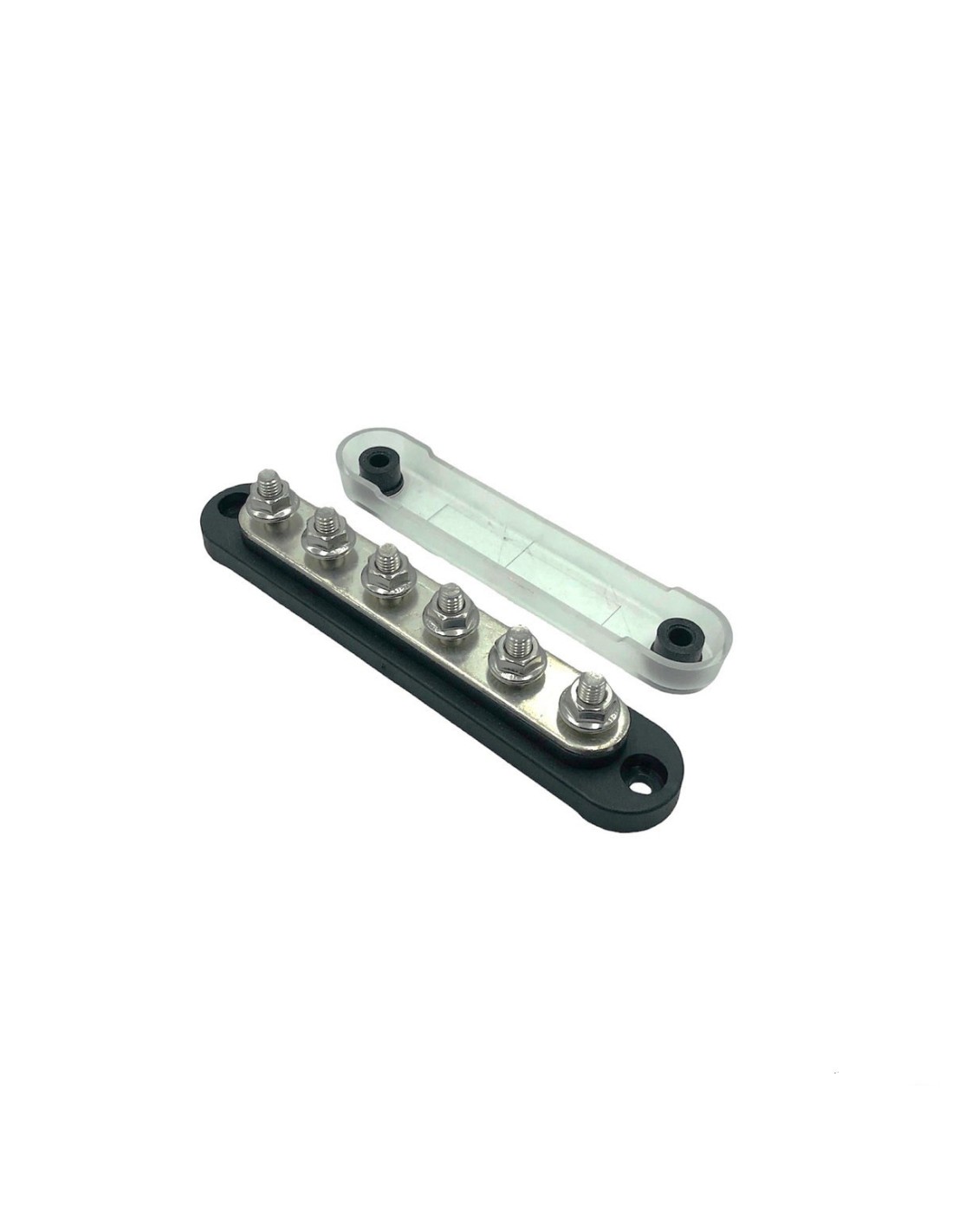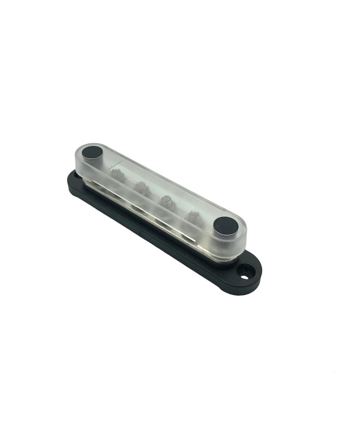 Barrette de connexion noire 4 broches x M10 + 4 vis x M4 maximum 250A - 48vdc avec capot de protection Dimensions 168 x 35 x h50 mm Entraxe de fixation 140 mm Matière plastique de couleur noire. Points de connexion multiples, pour accueillir plusieurs connexions d'alimentation, livrés avec couvercle de protection en plastique. Plaque de contact en laiton...