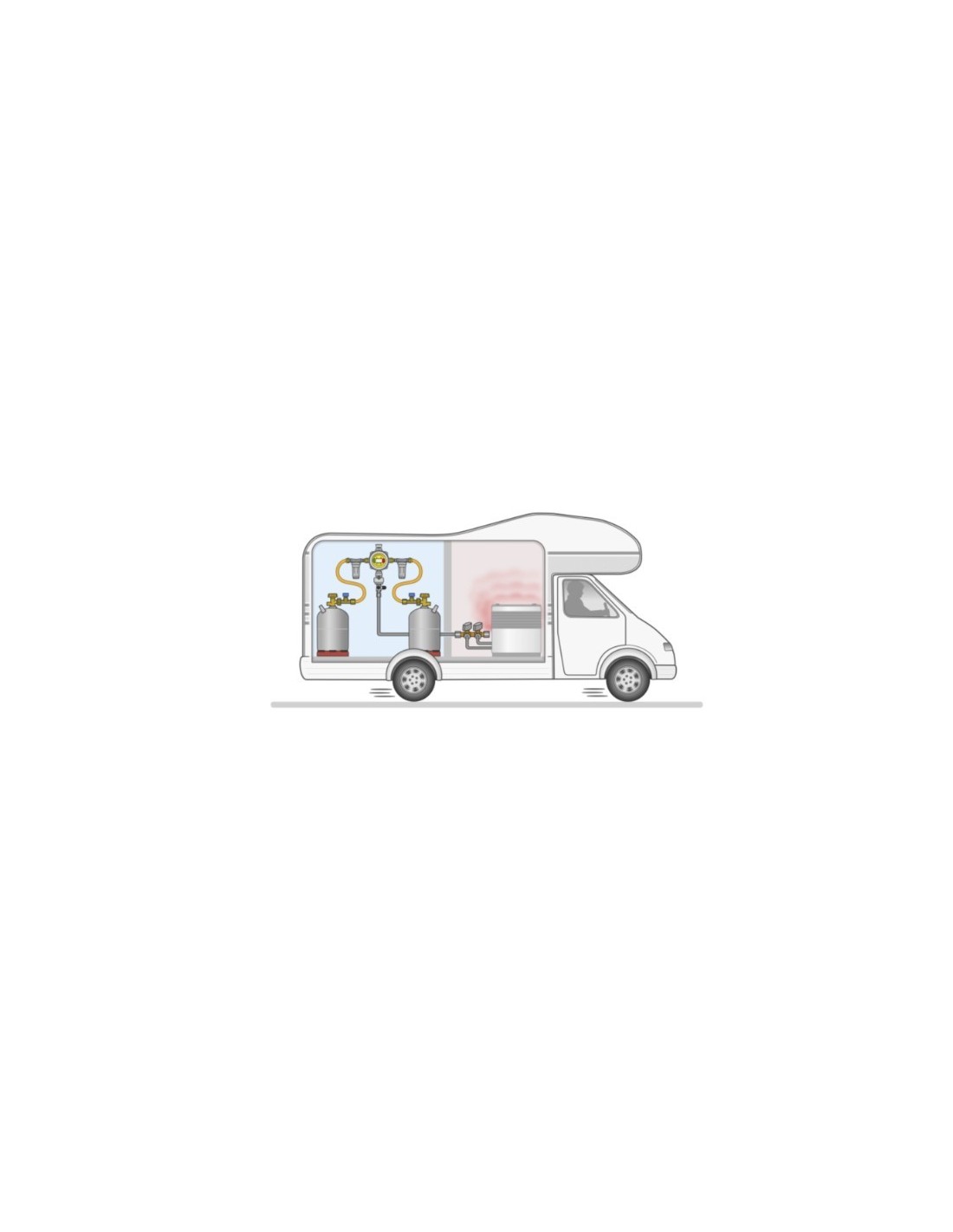 Système de sécurité de contrôle de la pression du gaz avec vanne de commutation automatique pour le fonctionnement d'installations à deux cylindres dans les caravanes et camping-cars pendant la conduite, pour le raccordement aux bouteilles de gaz via un tuyau haute pression, pour le contrôle de la pression à la pression nominale de l'appareil à gaz.