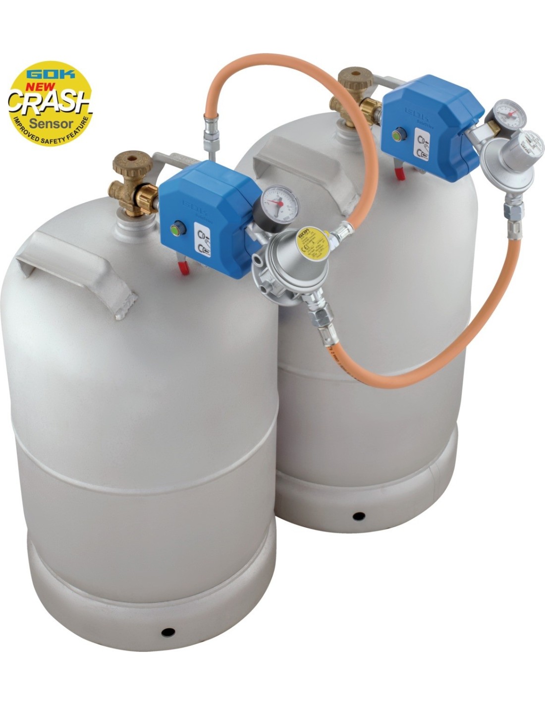 Système de commutation automatique de pression de gaz de sécurité pour le fonctionnement des systèmes à deux cylindres dans les camping-cars et les caravanes pendant la conduite, pour connexion directe à la bouteille de gaz composé de : régulateur central et de commutation avec nouveau capteur de collision mécanique avec pendule et manomètre, flexibles moyenne pression et support de régulateur.
