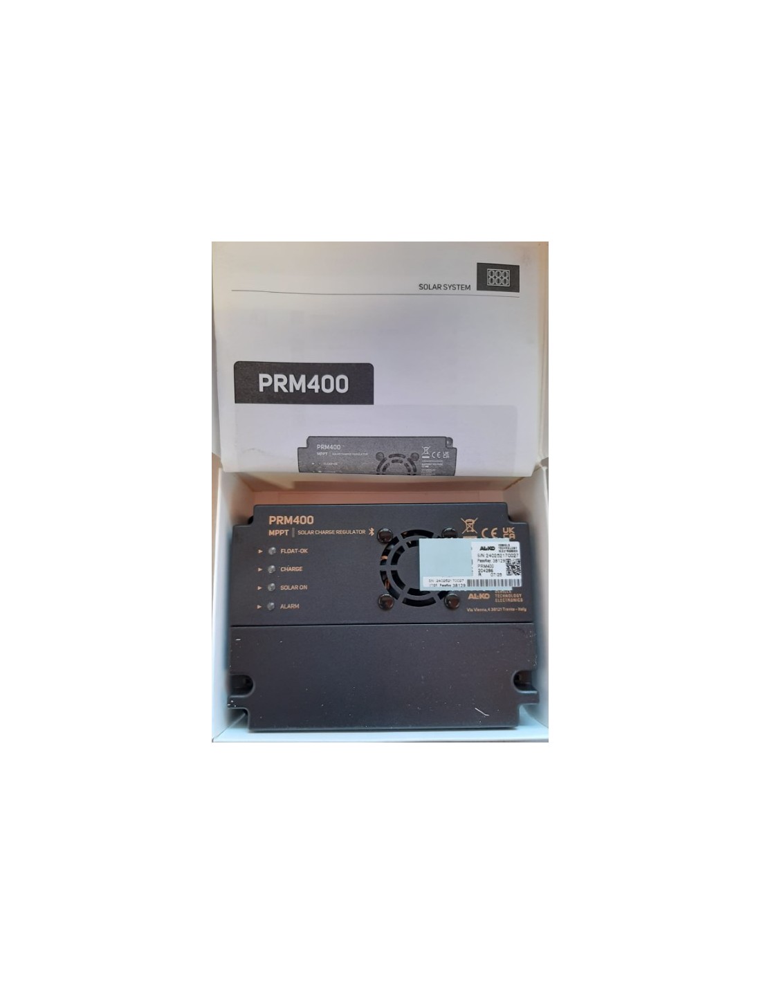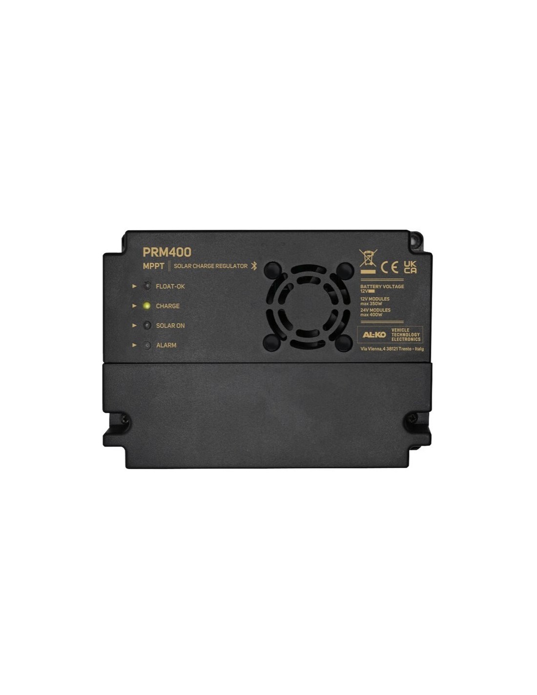 Le contrôleur solaire PRM400 est capable de charger automatiquement les batteries au plomb-acide (liquide, gel et AGM) et lithium à 12V, contrôlant et limitant l’énergie fournie par les modules photovoltaïques connectés. Il dispose d’un système MPPT (Maximum Power Point Tracker) qui lui permet de prendre la puissance maximale que le module photovoltaïque peut fournir dans n’importe quelle situation. Le PRM400 convient à l’utilisation avec des modules photovoltaïques allant de 32 à 72 cellules jusqu’à une puissance maximale de 400 W. Pour des performances optimales de l’appareil, nous recommandons de connecter des modules photovoltaïques avec plus de 36 cellules en série, quel que soit le type d’installation