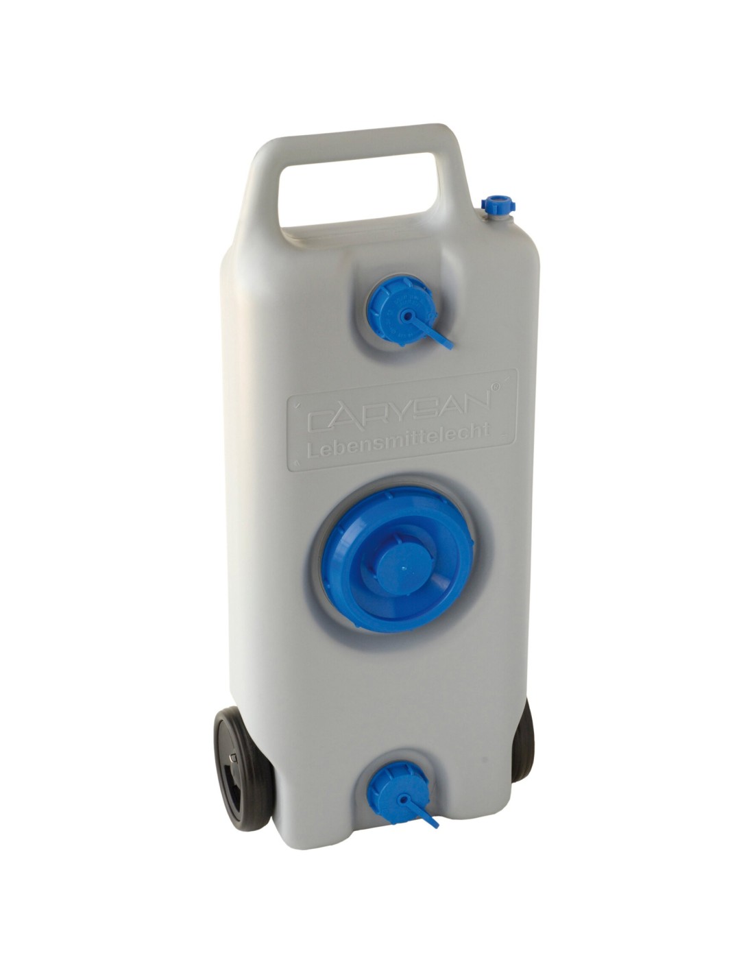 En polyéthylène HDPE à usage alimentaire, avec poignée de transport et pneus en PVC.
