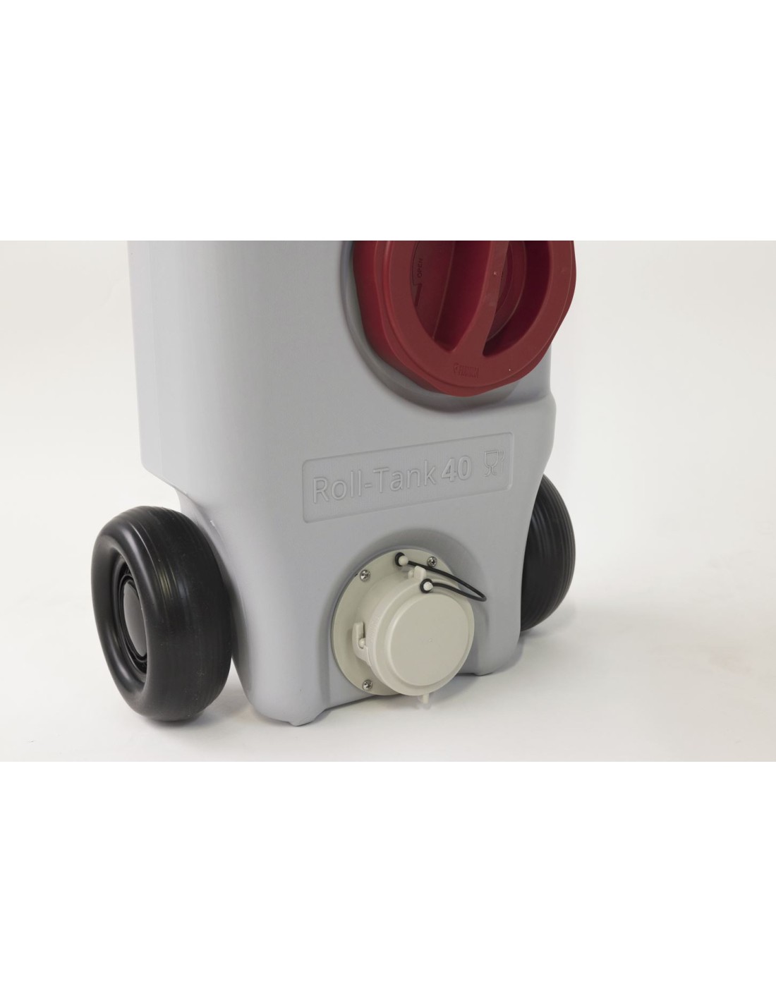 Réservoir d'eau potable de 40 litres avec poignée confortable et roues en caoutchouc anti-bruit qui facilitent le transport même sur des sols de gravier.