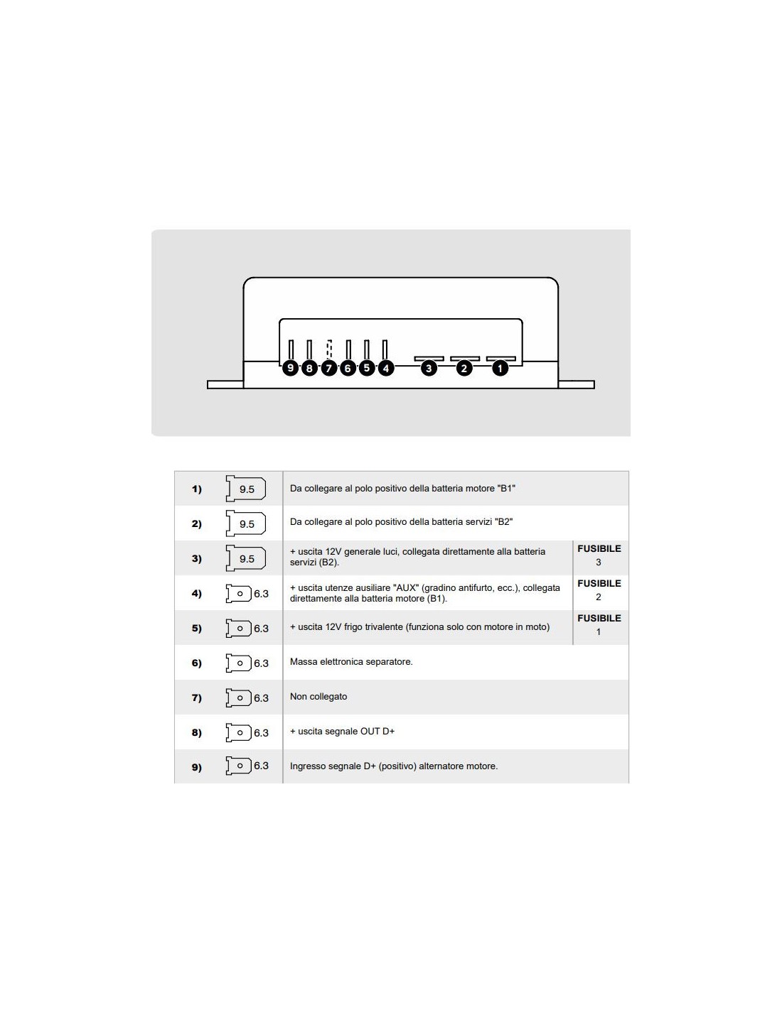 Parallèlement, si nécessaire, le relais qui alimente le réfrigérateur trois voies est également alimenté. La fonction de charge de la batterie moteur est également intégrée à l'intérieur du séparateur : lorsque la batterie de service est rechargée à partir de 230 V ou depuis le panneau solaire, une partie de la charge sera transférée à la batterie moteur (2A).