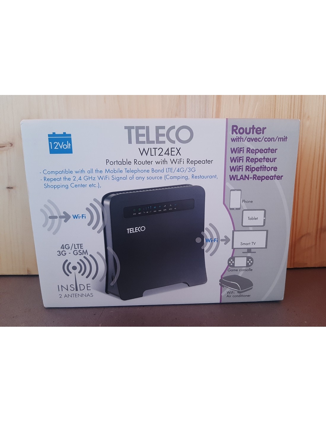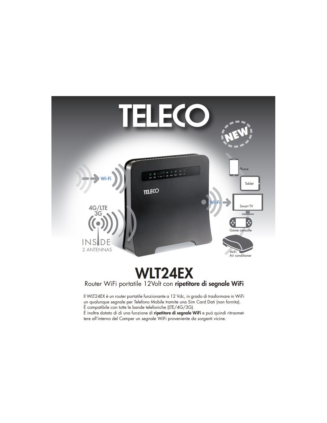 Le nouveau routeur WLT24EX2 présente les mêmes dimensions et esthétique, ainsi que des caractéristiques techniques similaires au WFT402 WiFi, mais il est en outre équipé de la fonction répéteur de signal WIFI et peut donc retransmettre un signal WIFI depuis des sources disponibles à proximité, telles que le camping, les restaurants, les centres commerciaux, etc., à l’intérieur du camping-car.