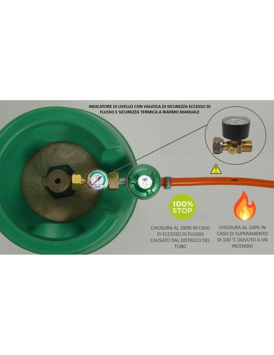 Indicateur de niveau pour bouteille GPL avec soupape de sécurité anti-débordement et soupape de sécurité thermique. Raccord d'entrée pour cylindre italien pivotant 20x1/14" gauche et sortie M 20x1/14"10