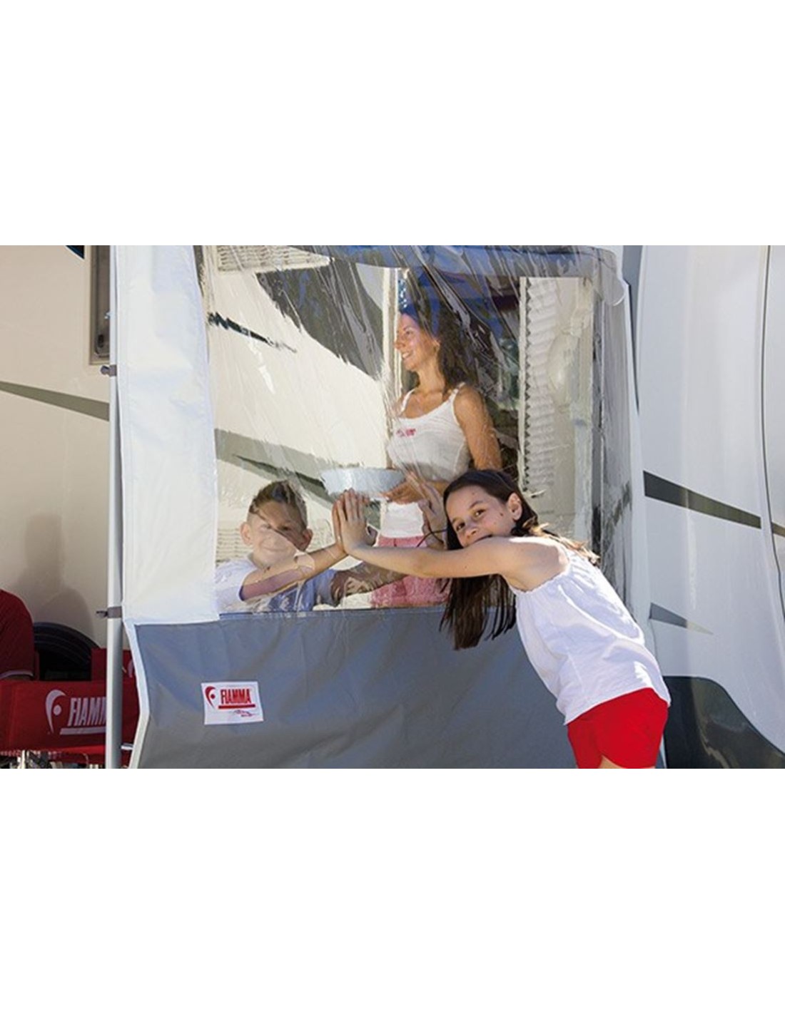 Fermeture latérale en vinyle avec grande fenêtre Crystal et extension grise au sol; imputrescible, anti-UV et lavable.