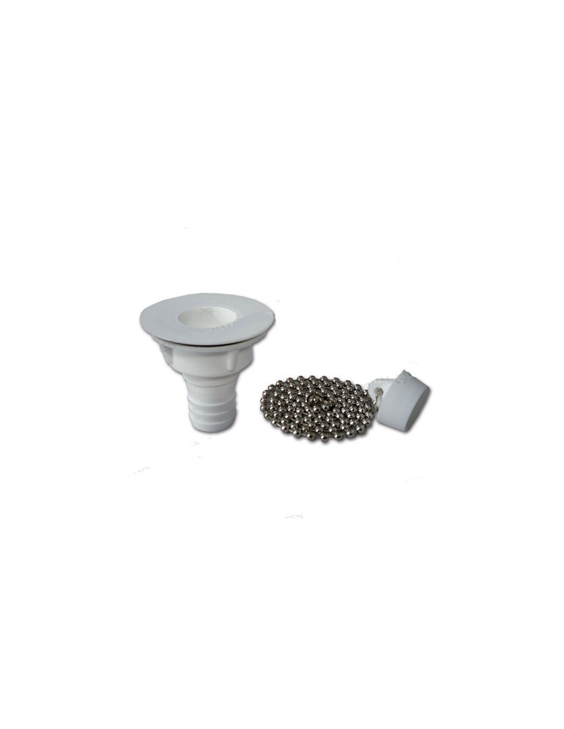 Bonde droite en plastique pour évier Ø 50 et support tuyau Ø 20mm, bouchon avec chaîne.