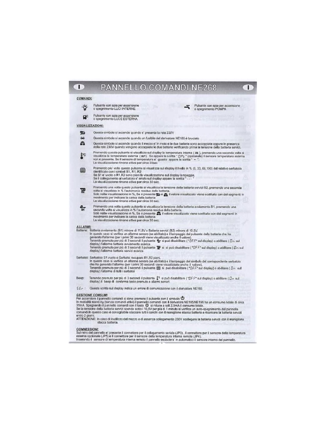 Service and engine battery voltage indicator, light and pump control, IN and OUT temperature, S1 tank, R1 and R2 FULL tanks.