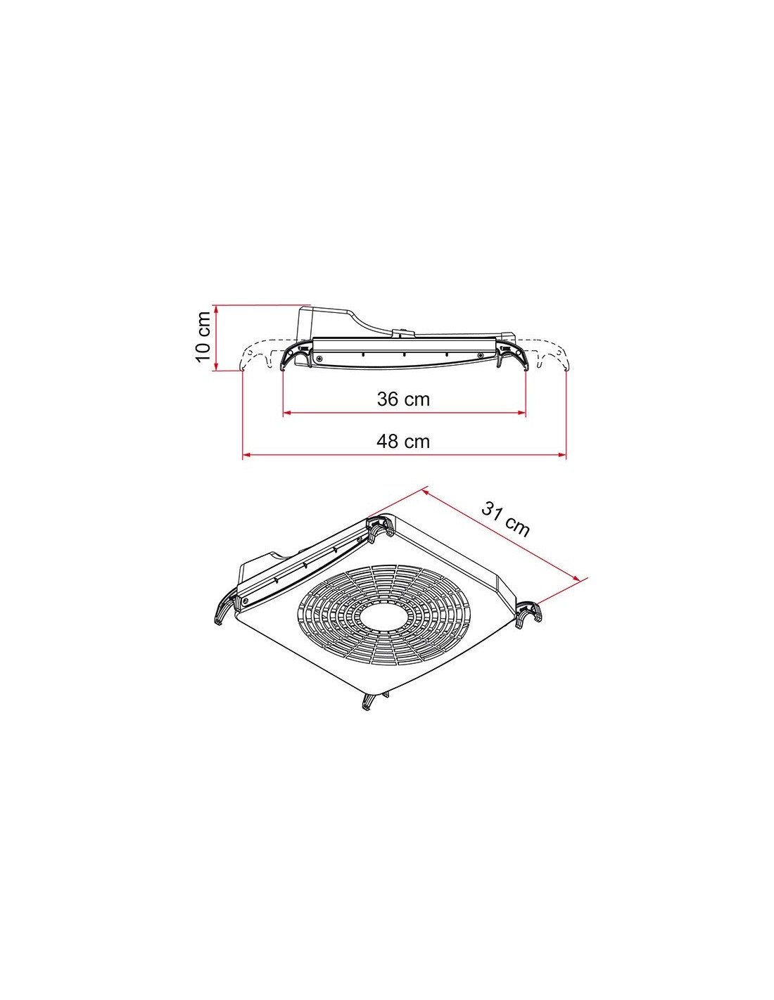 Composto da un gruppo ventilatore con ventola Ø 24 cm. e da 2 agganci telescopici regolabili da 36 a 48 cm.