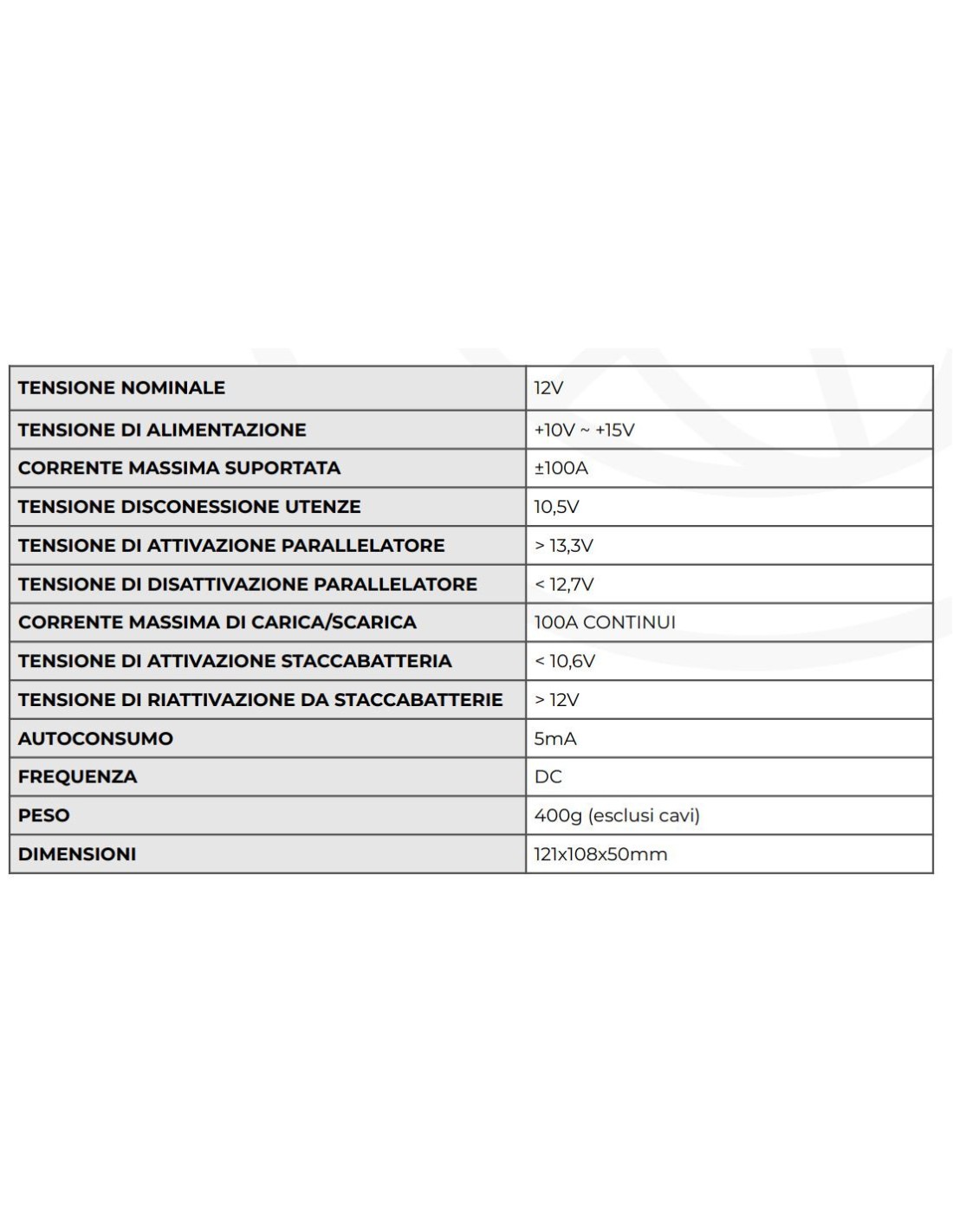 - Tensione atttivazione/disattivazione parallelatore: 13.3V/12.7V