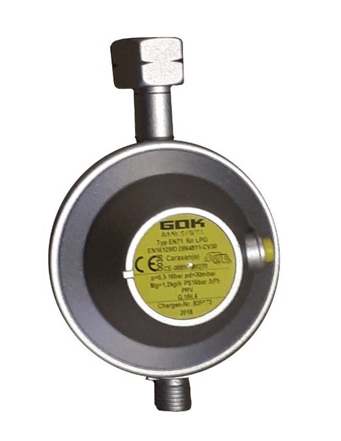 GOK gas regulator 29mbar 1,5 kg camping ITA - 01 115 09Inlet connection type G.1 = W20x1.814-LH ItalyOutlet connection type H.4 = G1 / 4 LHEN61 type for propaneEN16129
