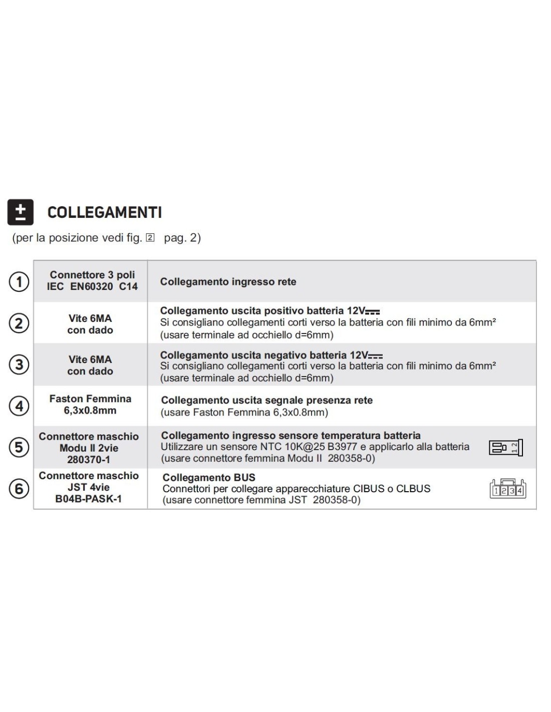 When a load is inserted, the battery charger immediately supplies the necessary current, preventing the battery from discharging (this is true if the load current is less than the maximum current that the battery charger can supply; otherwise, the battery will still discharge with a current equal to the difference: (ILOAD - ICHARGE BATTERY). A temperature probe can be connected to the battery charger (to be placed on the battery), to adapt the selected charging algorithm to the battery temperature.