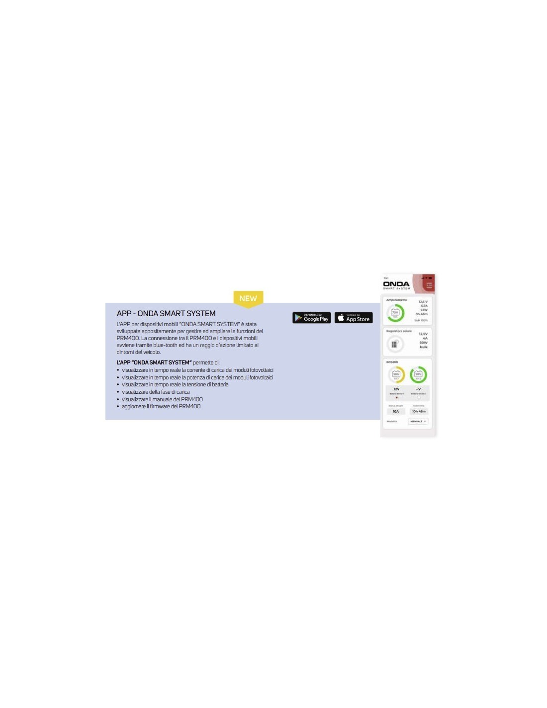 The "ONDA SMART SYSTEM" mobile APP has been developed specifically to manage and expand the functions of the PRM400. The connection between the PRM400 and mobile devices is via blue-tooth and has a limited range of action