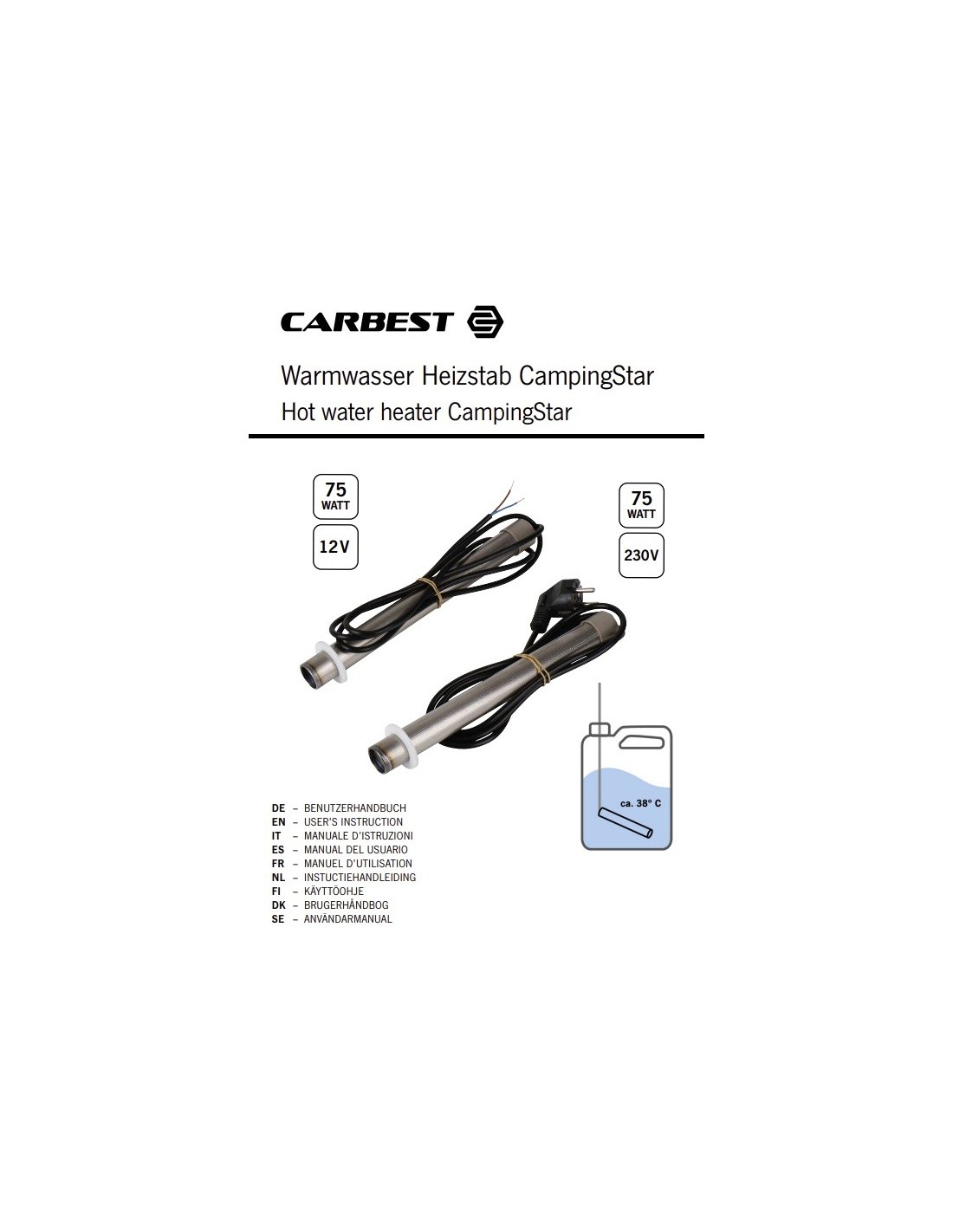 Electric Water Heater - Heating Rod for Hot Water in Tanks Carbest Campingstar 12V 75W, Temperature 38°C