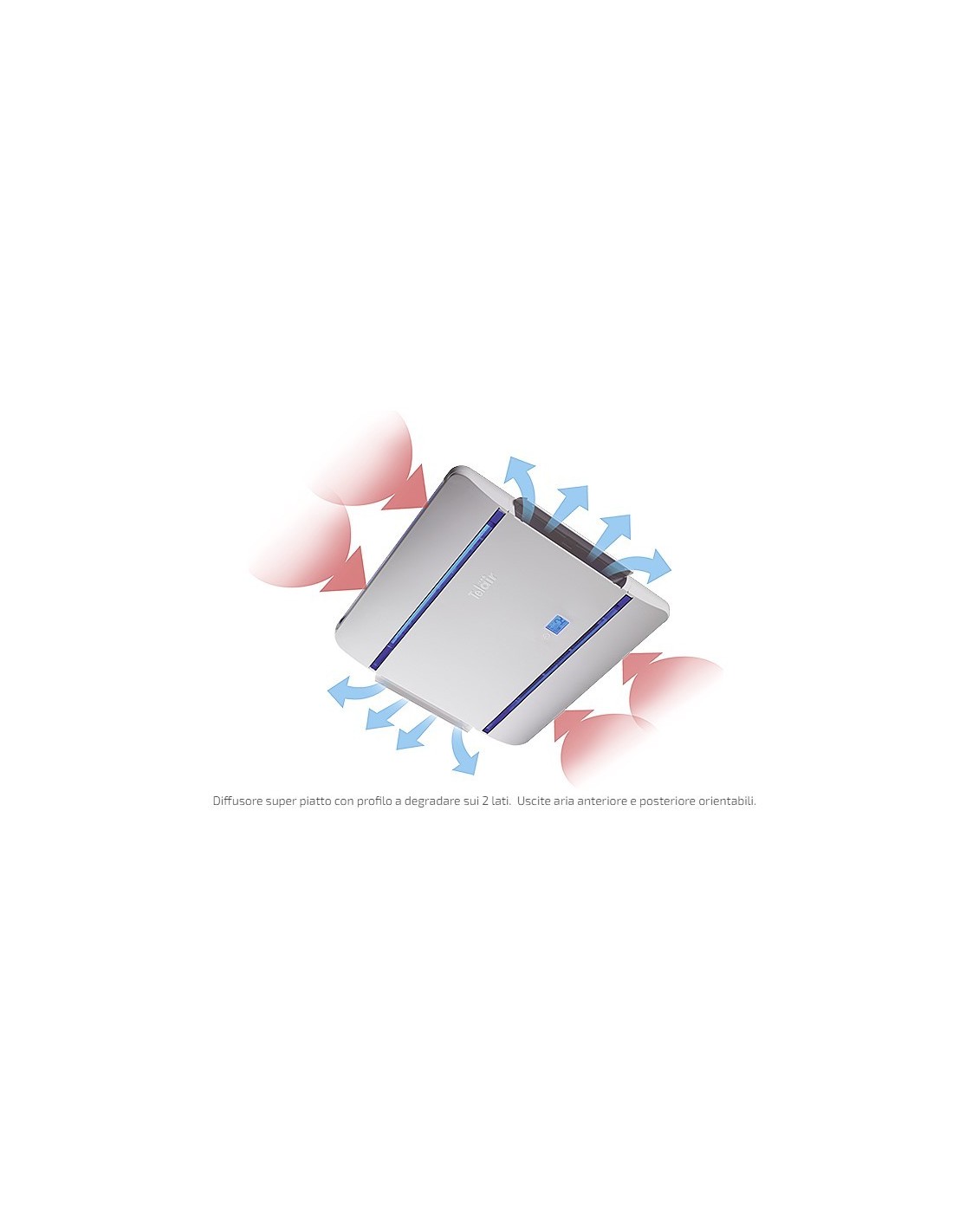 Silent diffuser, small, compact, only 4.2 cm thick, with the cold air outlet that can be set in two directions (front and back) or concentrated in a single one. Easy to clean, with two dust filters that can be extracted effortlessly and washed in running water whenever you want. Equipped with a blue multifunction display and LED lights that can be activated by remote control.