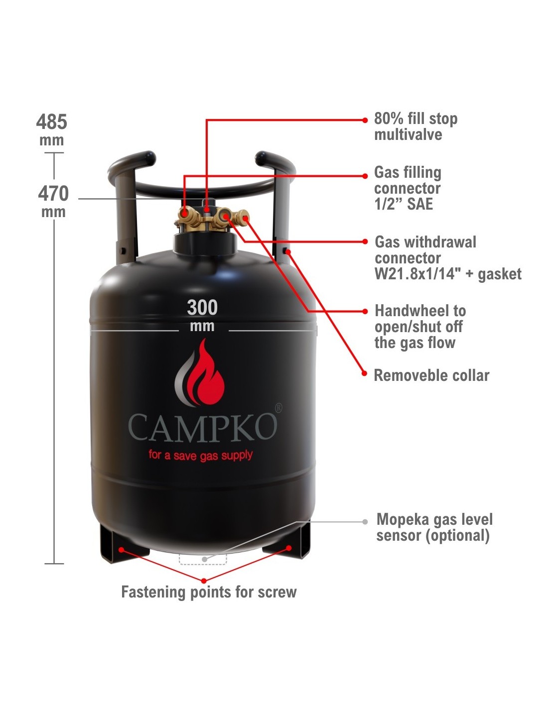 CAMPKO gas cylinder 67R01 steel 22 L - 11 Kg GAS multivalve and pressure gauge
