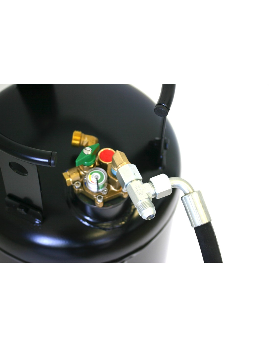 DREHMEISTER T-fitting with 3/4"-16 UNF thread for LPG filling hose - allows simultaneous filling of two gas cylinders or tanks. The T-fitting can be attached to the side of the cylinder or tank and to the filling valve. ©HybridSupply