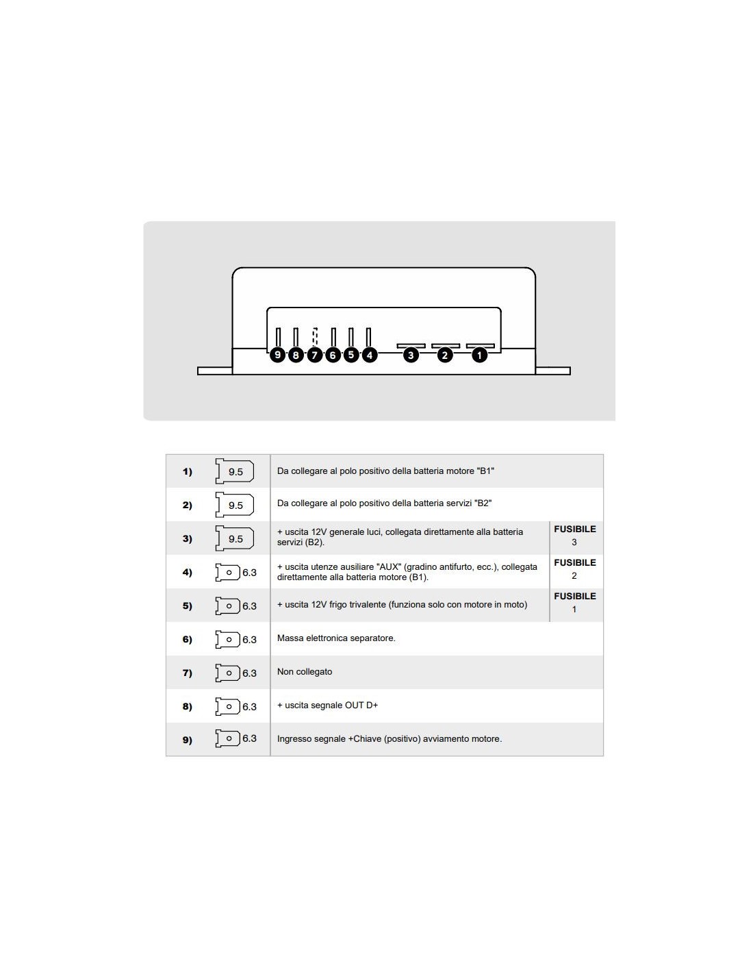 Staccabatterie e selettori di batteria con contatti protetti contro il cortocircuito accidentale da una scocca con coperchio inferiore smontabile e pareti laterali predisposte per l’uscita dei cavi nella posizione desiderata.
