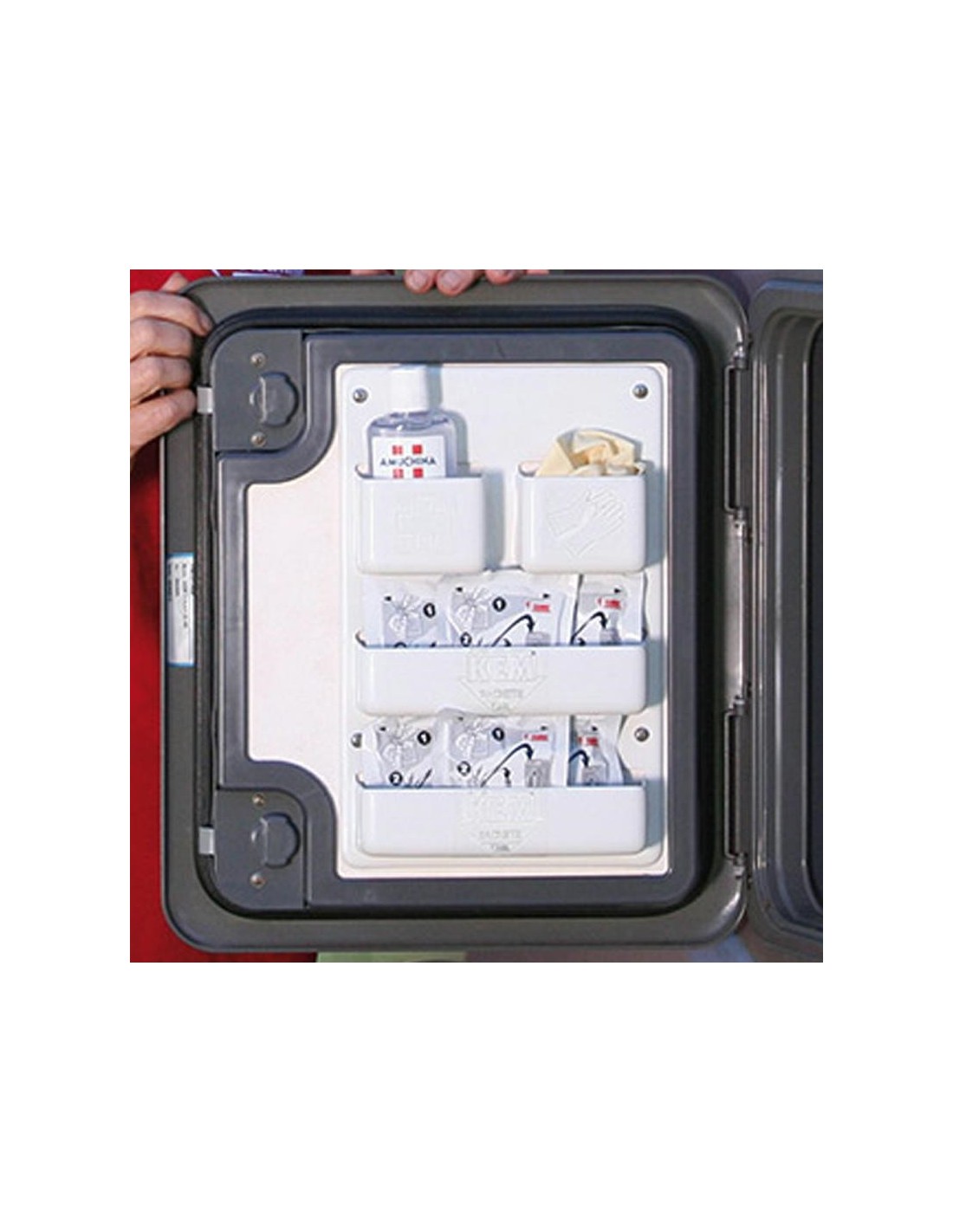 Ideal for storing bags of Super Kem Sachets in powder, disposable hygienic gloves, sanitizing liquid and various cleaning materials.