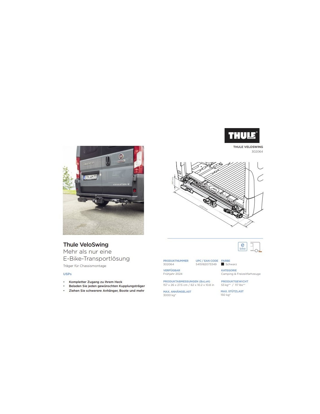 Thule VeloSwing black 95° swivel bike rack mount, fits Fiat Ducato/Boxer/Jumper after 2007 and Opel Movano after 2022 - 302064